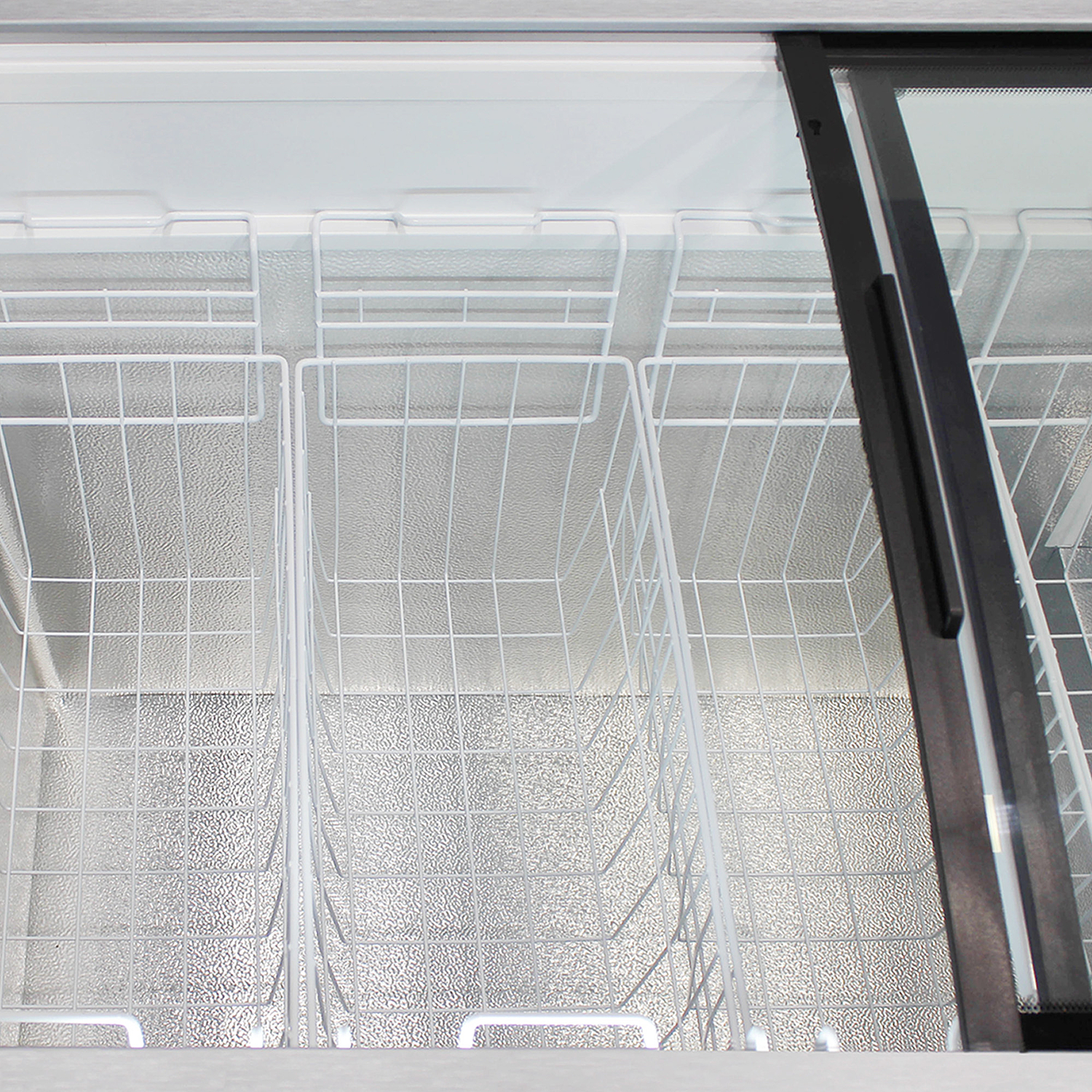 Морозильный ларь Бирюса CF41 с гнутыми раздвижными стеклами обеспечивает наилучшую демонстрацию товара и обеспечивают легкий доступ к продуктам. Превосходный обзор в сочетании с большой площадью экспозиции повышают эффективность торговли. Специально подобранный угол наклона раздвижных стекол исключает эффект световых бликов.