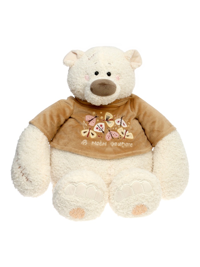 Мягкая игрушка «Медведь Тато в кофейной майке» — уютный плюшевый медвежонок с мягким, слегка винтажным характером. Светлый мех, вышитые детали и кофейная майка с надписью создают образ доброго, немного задумчивого героя, который сразу вызывает симпатию.