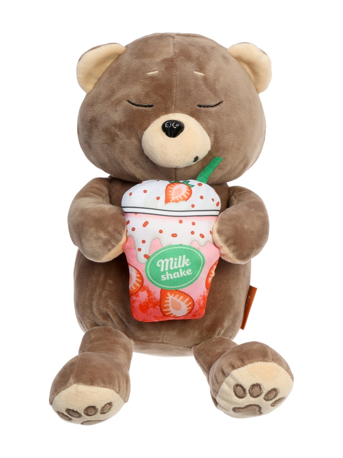 • В лапках мишки — милый аксессуар в виде стакана с клубничным милкшейком, что подчёркивает его игривый характер и уникальность.