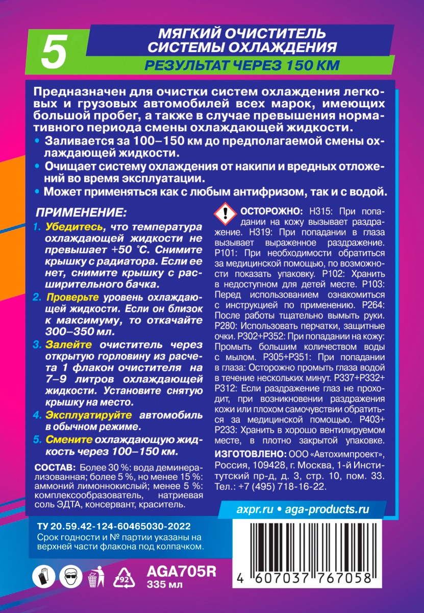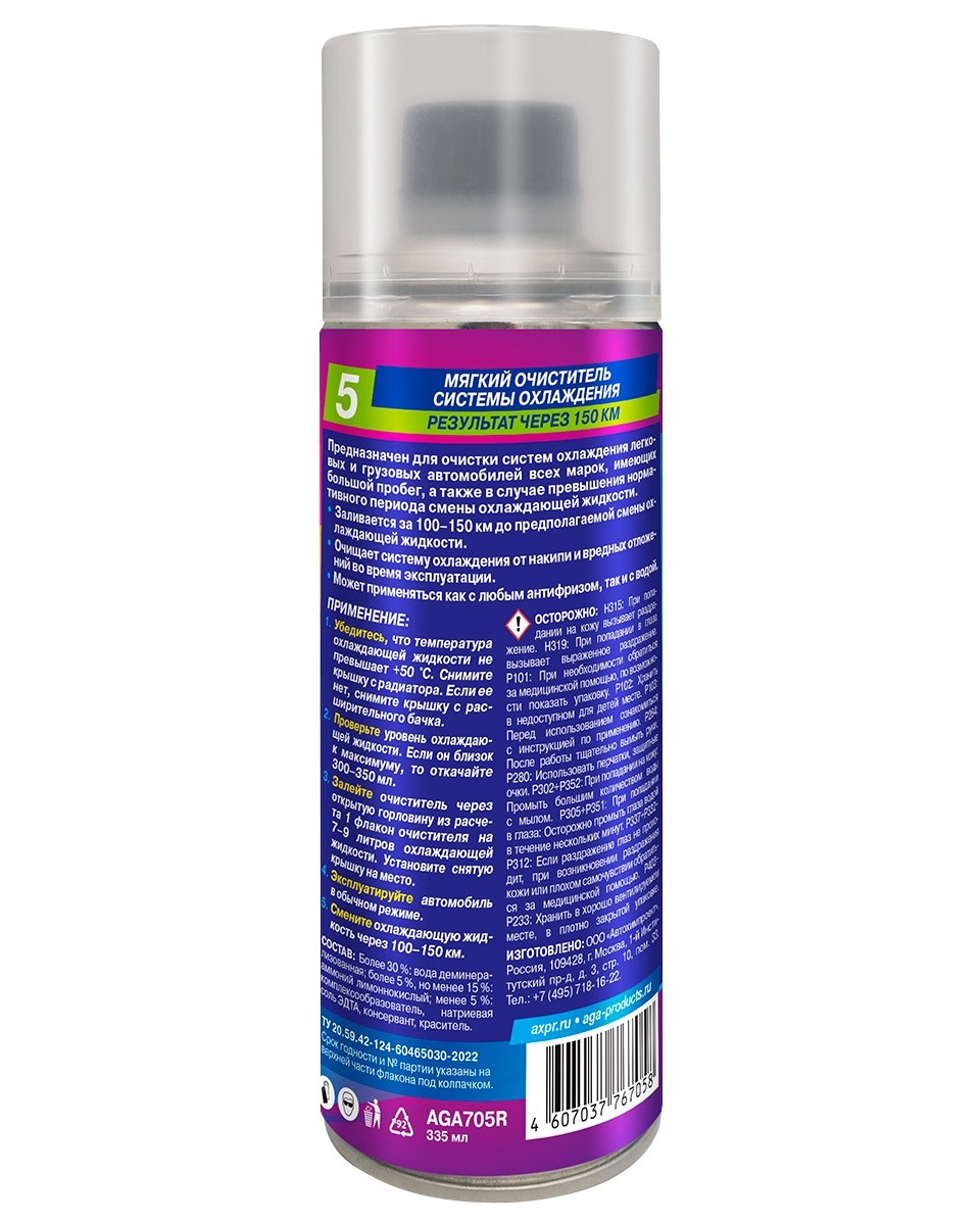 Мягкий очиститель системы охлаждения AGA705R. Результат через 150 км. Предназначен для очистки систем охлаждения автомобилей с большим пробегом, а также в случае превышения нормативного периода смены охлаждающей жидкости. Заливается за 100-150 км до предполагаемой смены охлаждающей жидкости. Позволяет очистить систему охлаждения от отложений во время штатной эксплуатации. Может применяться как с любым антифризом, так и с водой. ПРИМЕНЕНИЕ: 1. Заглушите и остудите двигатель до теплого или холодного состояния. 2. Снимите крышку с радиатора, а если ее нет, то с расширительного бачка и залейте состав в систему через открытую горловину из расчета 1 банка на 7-9 литров охлаждающей жидкости. 3. Обеспечьте нормативный уровень охлаждающей жидкости. Установите снятую крышку на место. 4. Эксплуатируйте автомобиль в обычном режиме. 5. Смените охлаждающую жидкость через 100-150 км.