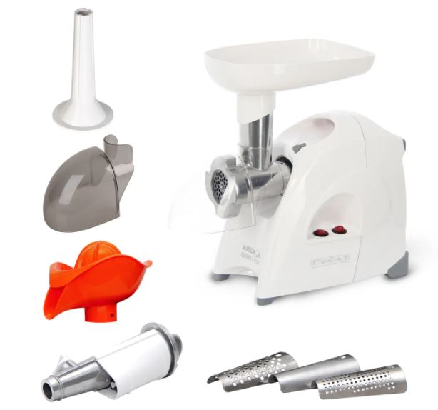 Максимальная мощность - 1700 Вт. Максимальная производительность – 2 кг/мин. В комплекте: приставка для набивки колбас; соковыжималка для цитрусовых; шнековая соковыжималка; экран для защиты от брызг; 3 решетки из нержавеющей стали с отверстиями Ø 4,9 мм, 7 мм, продолговатыми отверстиями; нож из нержавеющей стали с саблевидными режущими кромками, 3 сменных пластиковых колпачка Преимущества: • Двойная защита от перегрузки • Увеличенное время непрерывной работы – 30 минут • Функция «реверс» для предотвращения наматывания жилок на шнек • Удобное хранение шнура питания и решеток в отсеке с откидной крышкой • Возможность вертикального хранения для экономии пространства"