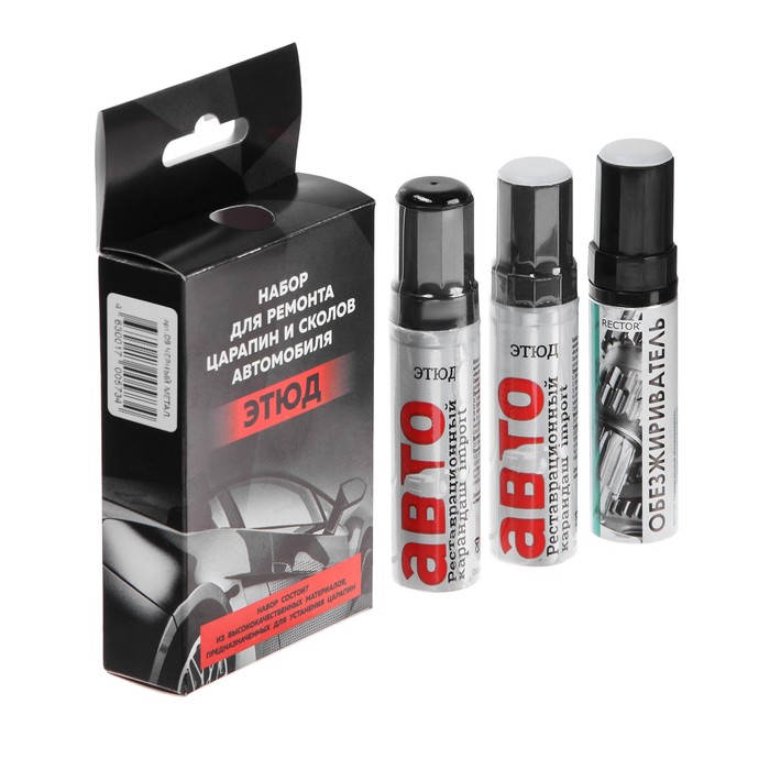 Мелкие повреждения, сколы, счёсы или царапины, могут легко устраняться самостоятельно, без обращения к специалистам на СТО. Набор для ремонта царапин и сколов автомобиля ЭТЮД – идеальный реставрационный комплект для устранения незначительных дефектов на лакокрасочном покрытии автомобилей. Тонкая кисточка позволяет аккуратно закрасить царапину или скол, не выходя за пределы повреждения. Правильно подобрать нужный оттенок эмали поможет оригинальный образец цвета на крышке реставрационного карандаша. Автомобильный бесцветный лак ЭТЮД 12 мл – это финальный защитный слой для автомобильных эмалей, защищает покрытие от химических и физических повреждений.