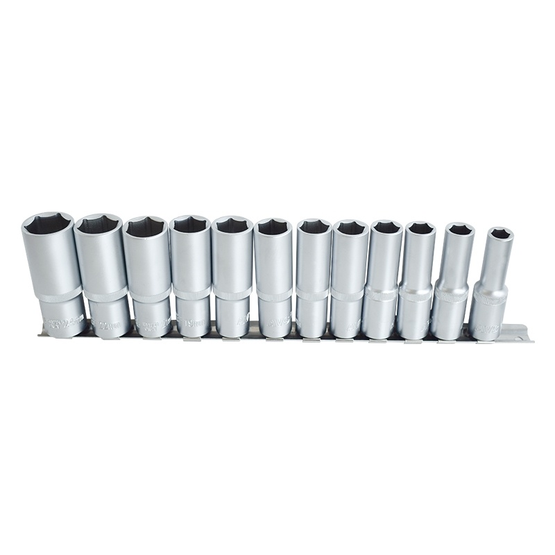 Набор укомплектован стальной рейкой с отдельными посадочными местами для каждой головки. Применяются в сфере ремонта и обслуживания автомобилей и других работ с резьбовым крепежом. Головка торцевая 6-гранная глубокая 1/2"DR: 10 мм, 12мм, 13 мм, 14 мм, 15 мм, 16 мм, 17 мм, 18 мм, 19 мм, 21 мм, 22 мм, 24 мм. Закалены до твердости 45-48HRC