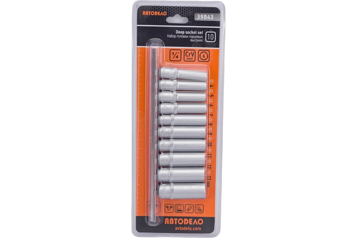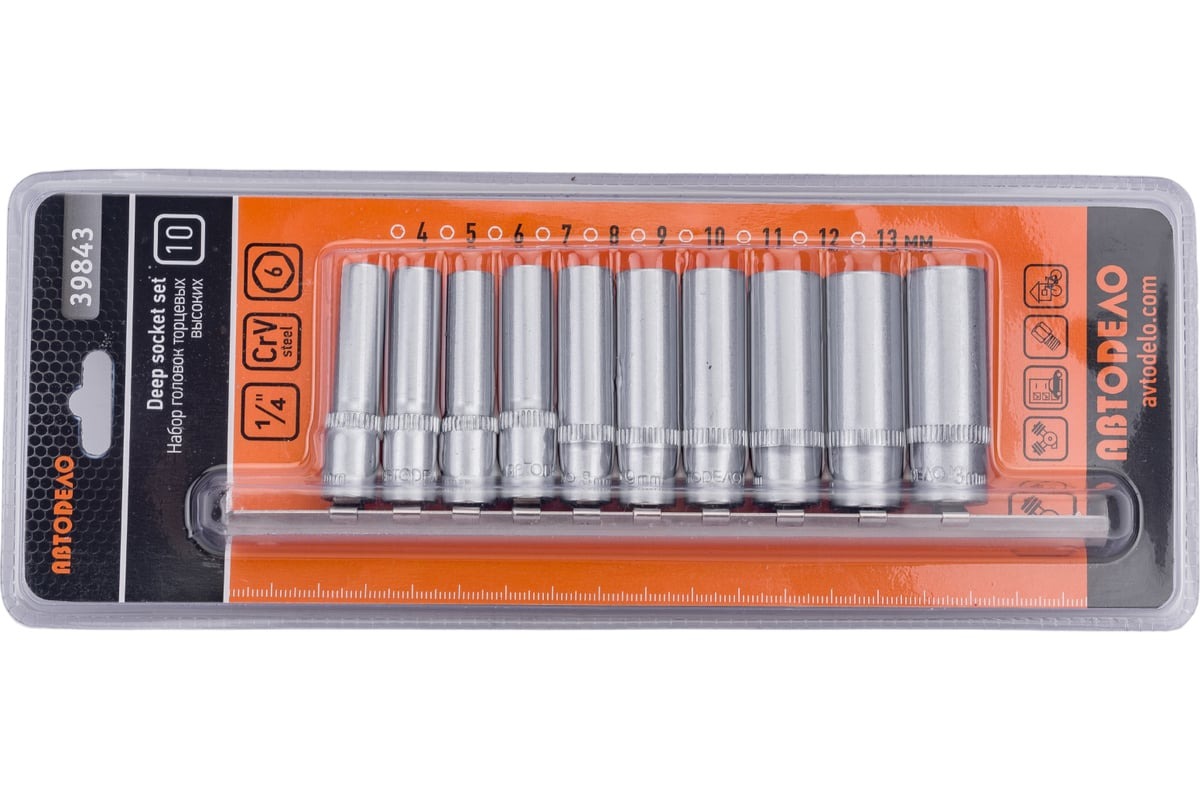 Набор головок АвтоDело применяется для работы с крепежом, головки изготовлены методом холодной штамповки из стали CRV. Присоединительный квадрат 1/4".