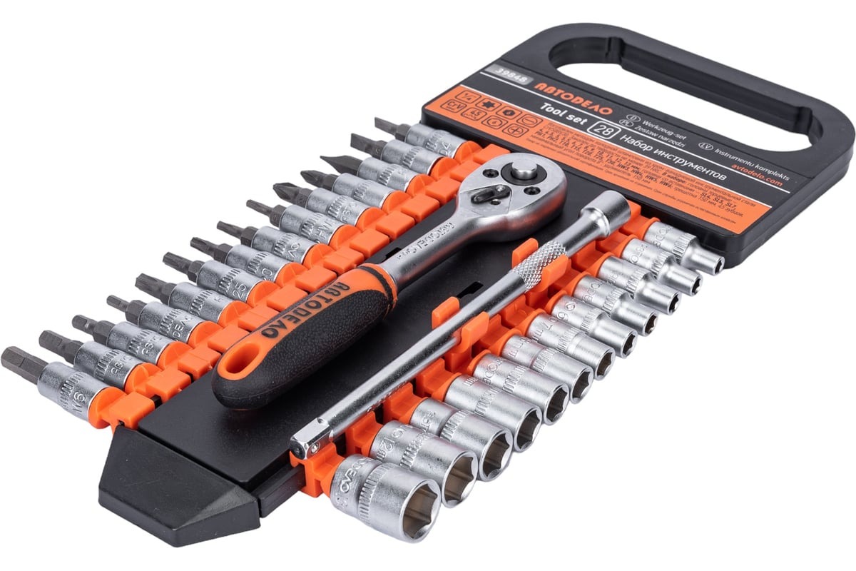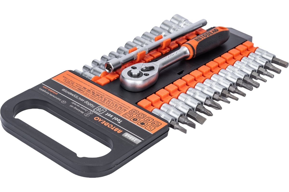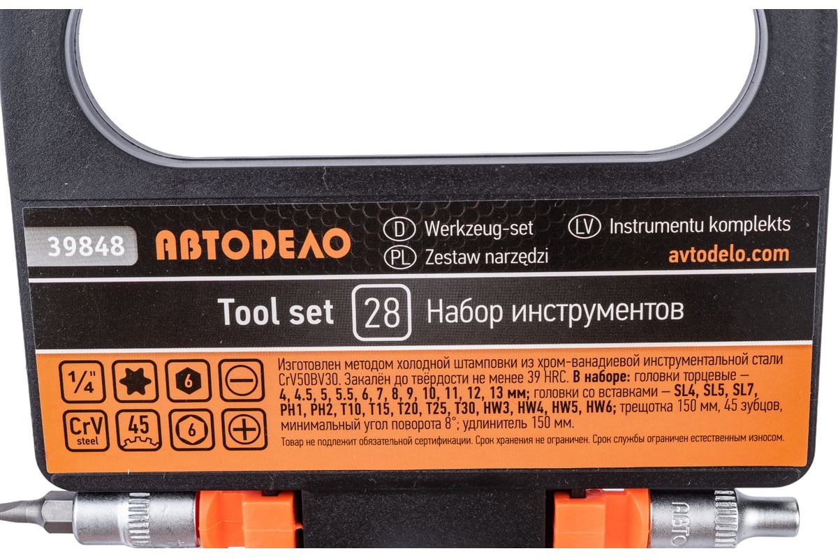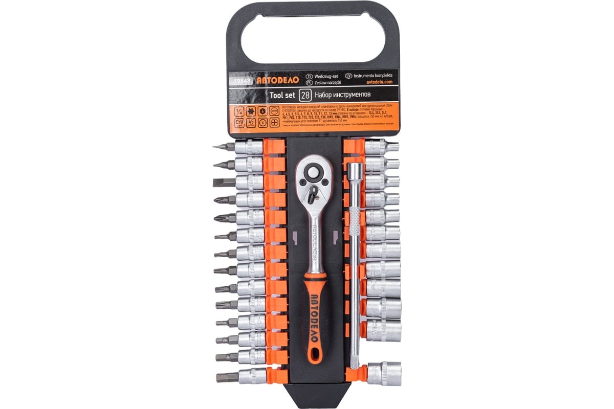 Набор АвтоDело укомплектован головками торцевыми, головками со вставками, удлинителем и флажковой трещоткой.