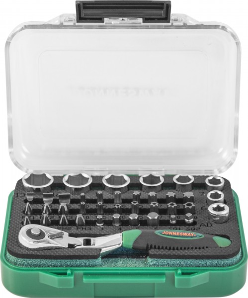 Набор рукоятка трещоточная миниатюрная 1/4"DR со вставками-битами и головками торцевыми из 40 предметов.