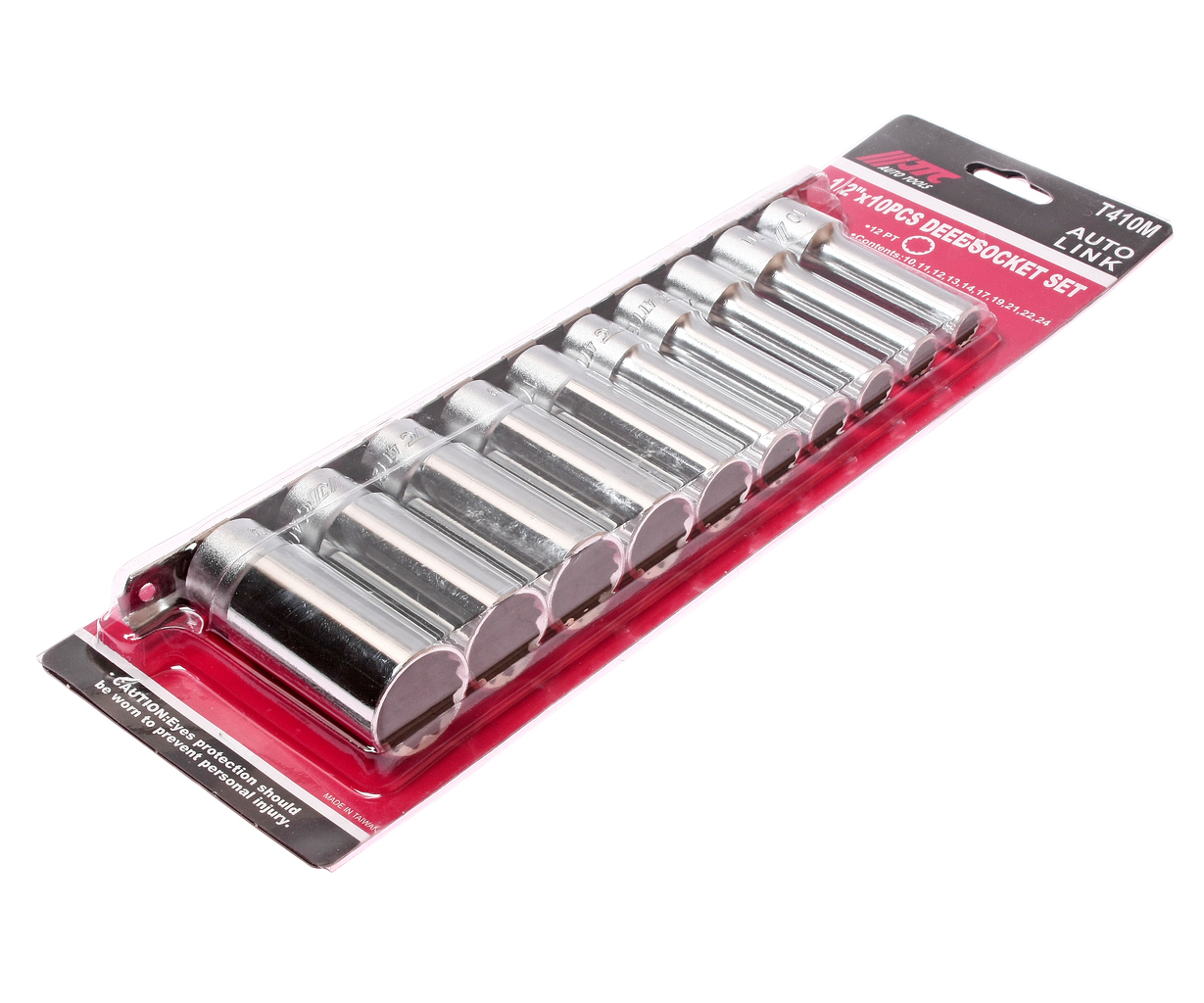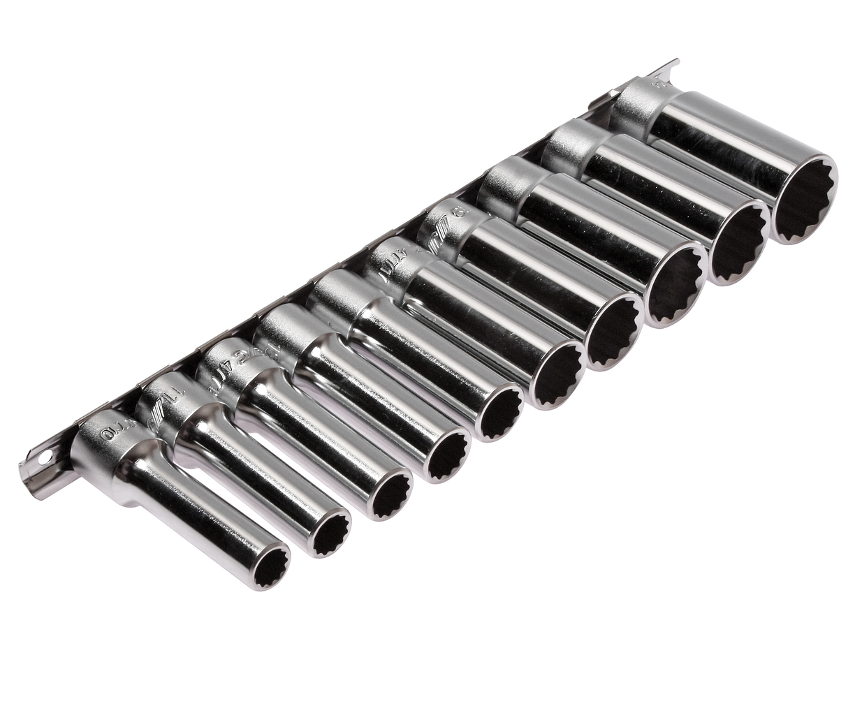 Набор торцевых головок JTC JTC‑T410M включает 10 глубоких 12‑гранных головок с посадочным квадратом 1/2 дюйма. Размеры головок: 10, 11, 12, 13, 14, 17, 19, 21, 22 и 24 мм. Длина каждой головки составляет 76 мм.