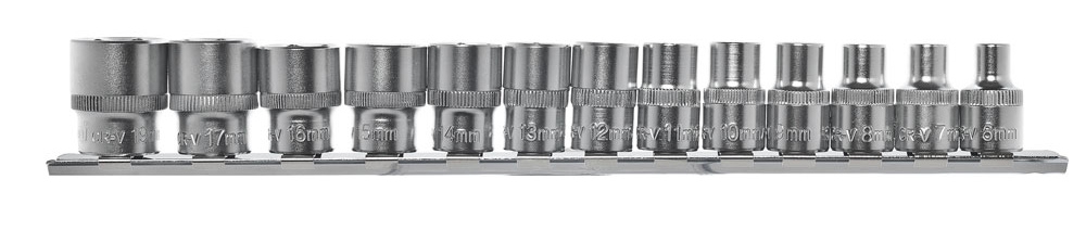 Набор торцевых головок 13 предметов позволяет производить слесарно-монтажные работы с различными типами крепежа в диапазоне размеров 6-19мм для работы с приводом 3/8''Dr.(9,5мм).