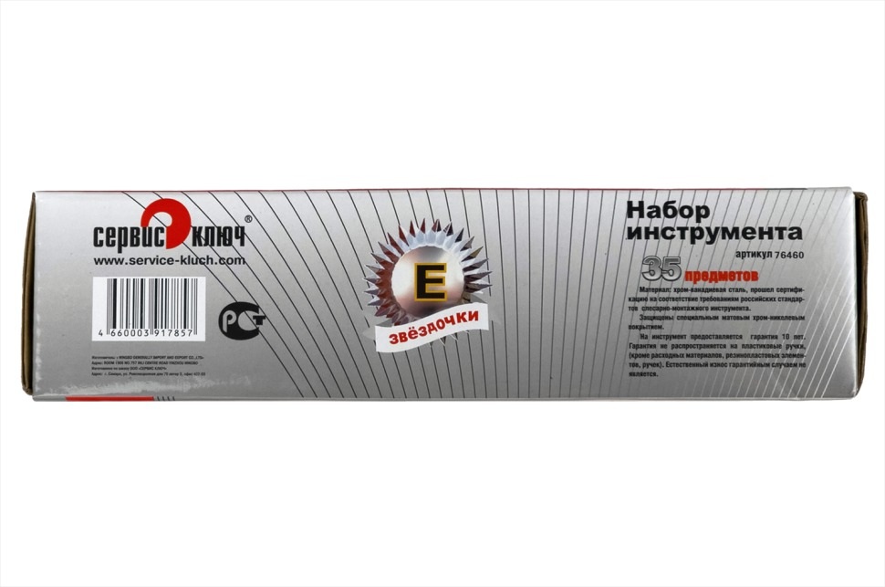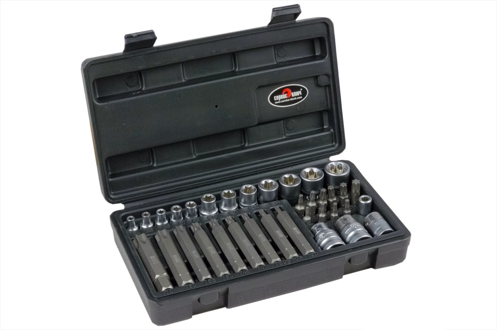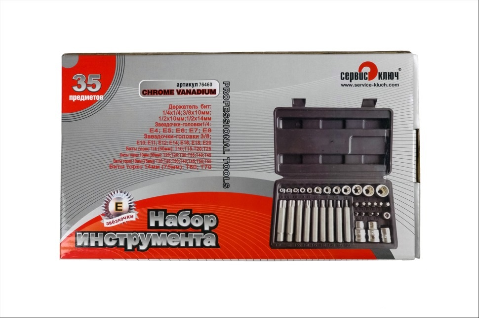 Набор звездочек-головок и вставок 35 предметов СЕРВИС КЛЮЧ - это универсальный набор инструментов для работы с различными видами крепежа. Он может использоваться в автомобильном, сельскохозяйственном и других отраслях. Набор включает в себя звездочки-головки и биты с разными размерами и профилями, которые подходят для большинства типов винтов и гаек. Набор найдет место не только в профессиональной мастерской, но и в гараже автолюбителя.
