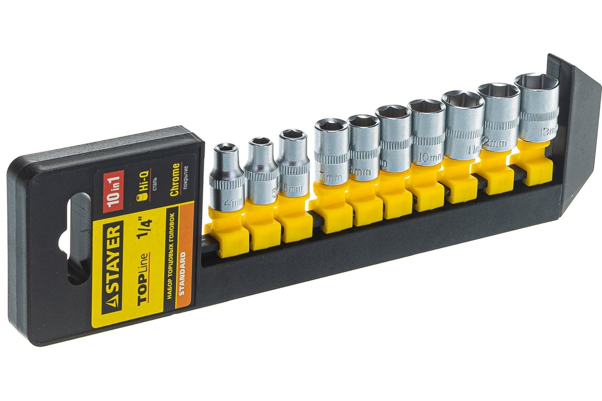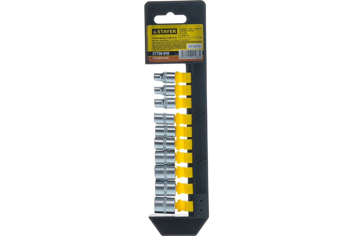 Головки торцевые "STANDARD" STAYER 27758-H10 применяется в мастерской, гараже для проведения ремонтных работ. Изготовлены из закаленной инструментальной стали с хромированным покрытием, защищающим оснастку от коррозии. Головки располагаются на пластиковом рельсе для удобства хранения и переноски.
