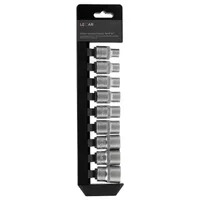 В комплект входит 9 головок: E10, E11, E12, E14, E16, E18, E20, E22, E24 — это полный набор наиболее востребованных размеров для обслуживания легковых и коммерческих автомобилей. Посадка — под квадрат 1/2", что делает комплект совместимым с большинством ручных инструментов: трещотками, воротками, моментными ключами.