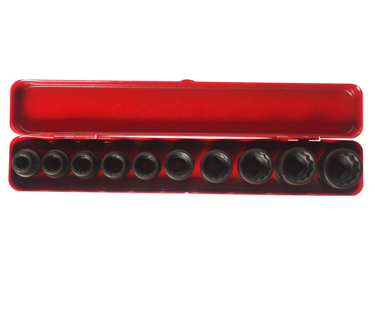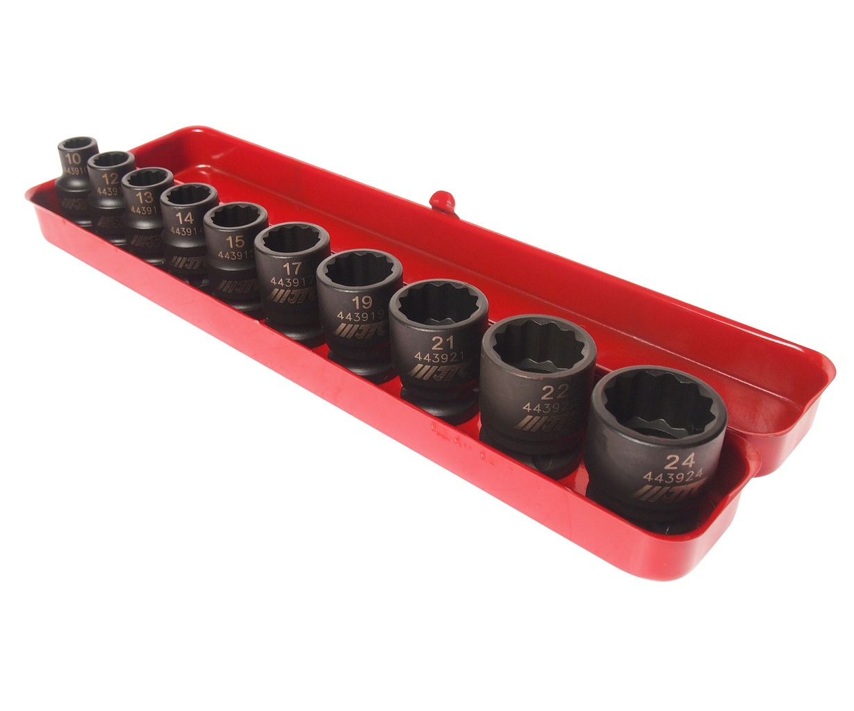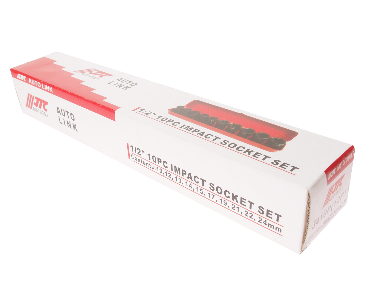 Набор ударных головок JTC J410P включает 10 предметов размером от 10 до 24 мм: 10, 12, 13, 14, 15, 17, 19, 21, 22 и 24 мм. Головки выполнены в 12‑гранном профиле и рассчитаны на посадку под ключ 1/2 дюйма (1/2" Dr.).