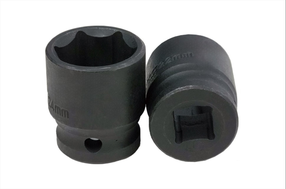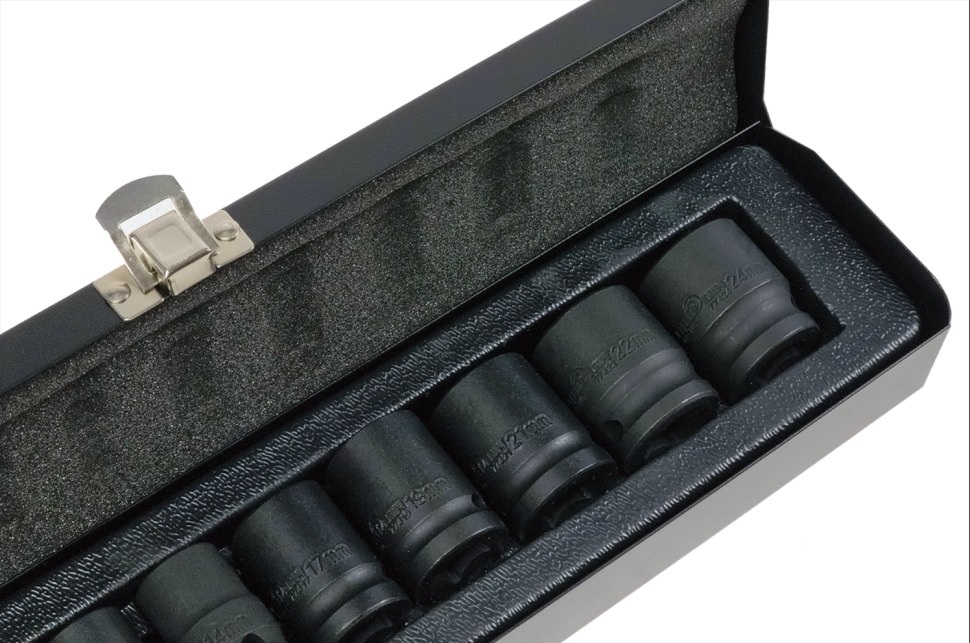 Набор ударных головок состоит из десяти головок разных размеров: 8, 10, 12, 13, 14, 17, 19, 21, 22 и 24 мм. Они изготовлены из хромованадиевой стали №40 (твердости 33-42 HRC), что обеспечивает устойчивость к длительным механическим нагрузкам, а также имеется специальное покрытие, которое защищает их от коррозии. Головки крепятся на квадрат с отверстием 1/2 дюйма, который обеспечивает надежную фиксацию, имеют шестигранный профиль, который обеспечивает плотный захват. Головки находятся в белом пластиковом лотке с отделениями для каждой головки, который обеспечивает порядок и удобство при использовании головок.