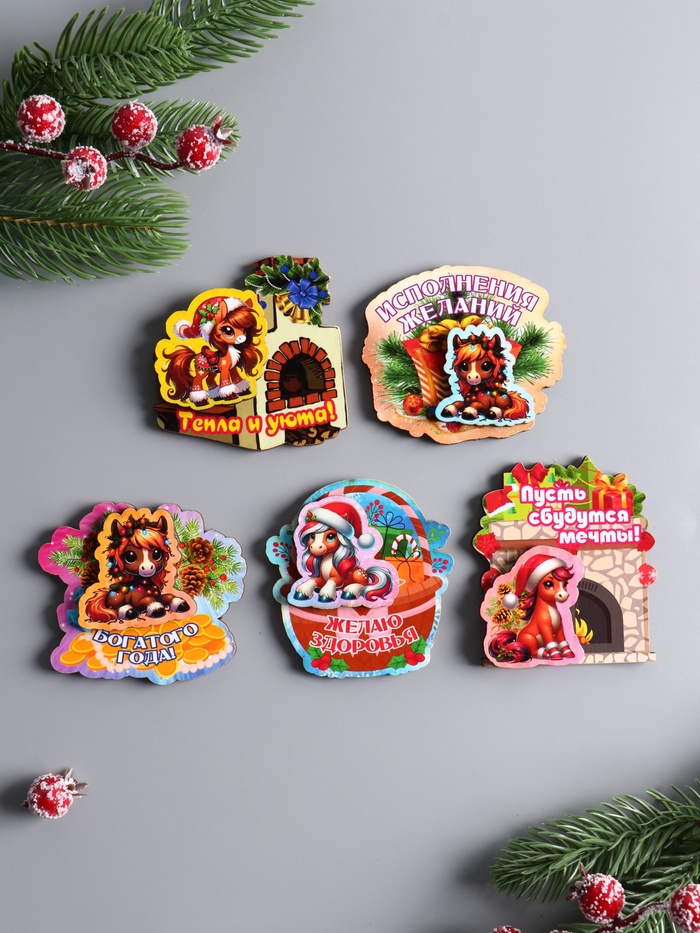 Погрузитесь в волшебство праздничного сезона с уникальными магнитами «Новогодние коняшки». Этот набор из пяти сувениров станет символом наступающего года Лошади и добавит яркий акцент вашей домашней обстановке. Созданные из дерева, эти магниты сочетают в себе изящество и тепло, принося уют и стиль в ваше пространство.
