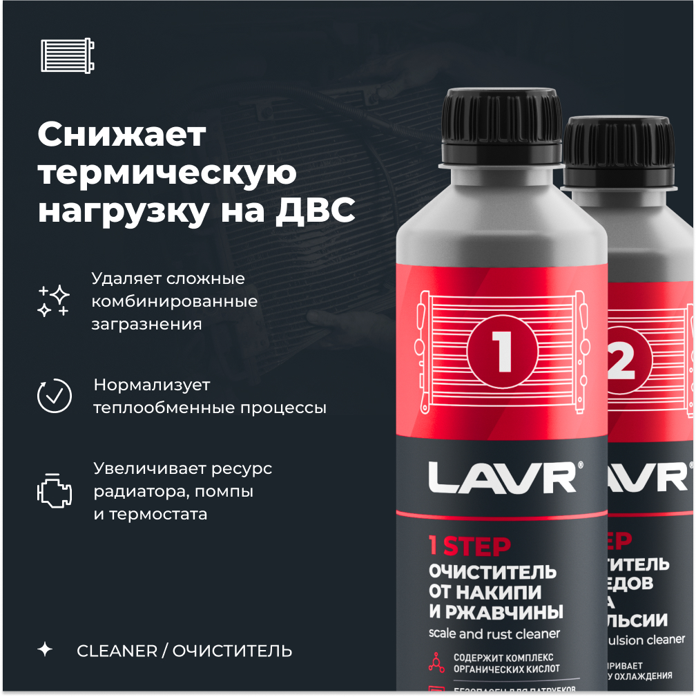 Набор Полная очистка системы охлаждения в 2 этапа LAVR, 310 мл / Ln1106. Набор Полная очистка системы охлаждения в 2 этапа - это два продукта для очистки СО от комбинированных загрязнений. На первом этапе кислотный состав растворяет неорганические загрязнения. На втором этапе щелочной состав устраняет органические остатки. В результате из системы максимально полно выводятся ржавчина, нагар, продукты распада антифриза, остатки масла и эмульсии. Подходит для всех типов систем охлаждения бензиновых и дизельных двигателей. Растворяет и выводит накипь, ржавчину, следы масла, продукты распада антифриза из каналов системы охлаждения, радиаторов. Снижает термическую нагрузку на ДВС. Продлевает срок службы нового антифриза на 30-40%. Увеличивает ресурс радиатора, помпы и термостата. Состав первого этапа содержит кислоты, состав второго этапа - щелочи. Объем средства подбирается из расчета 310 мл на промывку системы охлаждения объемом 10 л. Рекомендован при наличии неисправностей системы охлаждения. Подходит как для самостоятельного использования, так и в качестве сервисного средства. Перед применением прогреть состав до комнатной температуры и встряхнуть. Температура двигателя на момент начала процедуры должна быть не выше +80. 1. Слить антифриз из системы охлаждения. 2. Залить препарат №1 и долить дистиллированную воду до отметки MIN. 3. Прогреть двигатель и дать ему поработать 30 минут на холостом ходу. 4. Слить промывочный раствор. 5. Повторить пункты 2-4 с составом №2. 6. Промыть систему охлаждения: залить дистиллированную или чистую теплую воду, прогреть двигатель и дать ему поработать 10 – 15 минут на холостом ходу, слить воду. При необходимости повторить процедуру. 7. Залить новый антифриз.