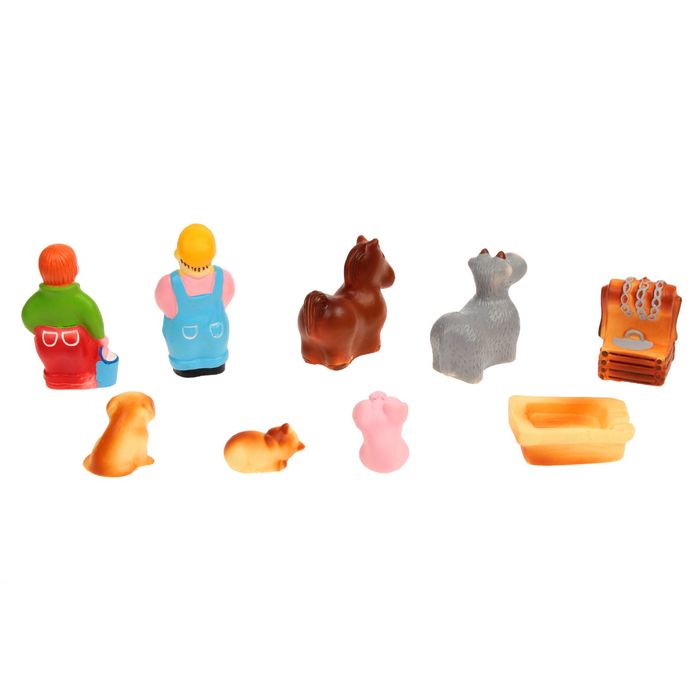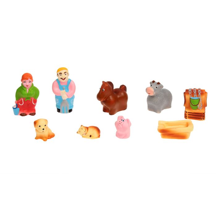 Красочная игрушка - это замечательный подарок для малыша и игрушка для веселых игр и купания. Набор резиновых игрушек от ЗАО ПКФ "Игрушки" позволит ребенку выстроить новые сюжеты, связанные с бытом крестьянского подворья. Заведуют этим подворьем крестьянин со своей женой, чье хозяйство включает в себя лошадь, корову, собаку, кошку и свинью. Также в комплект входят колодец и поильник для животных. А еще в наборе есть игровое поле, на котором написаны простые стишки для каждого персонажа, поэтому ребенок сможет полноценно играть с этим набором. Яркая фигурка не сломается и не потеряет форму с течением времени. Игрушки оказывают влияние на физическое, умственное, эмоциональное развитие маленьких детей, способствуют развитию речи и зрения. Разноцветная и функциональная игрушка своими яркими цветами привлечет и надолго удержит внимание малыша. Игрушки изготовлены из безопасных и гипоаллергенный прочных, износостойких материалов. Эта игрушка небольшого размера, легкая и красочная, ее удобно держать маленькой ручке малыша.