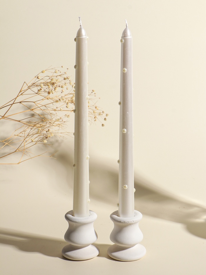 Набор из двух классических свечей создаёт атмосферу уединённого спокойствия. Их строгие белые формы напоминают столбы античных храмов, привнося в пространство ощущение гармонии и порядка. Эти свечи станут центром вечерней медитации или элегантным дополнением торжественного ужина.