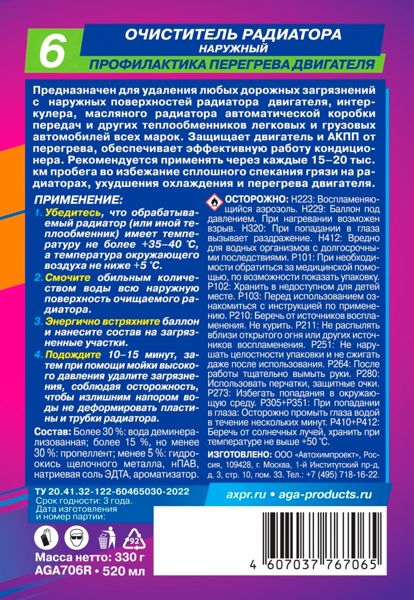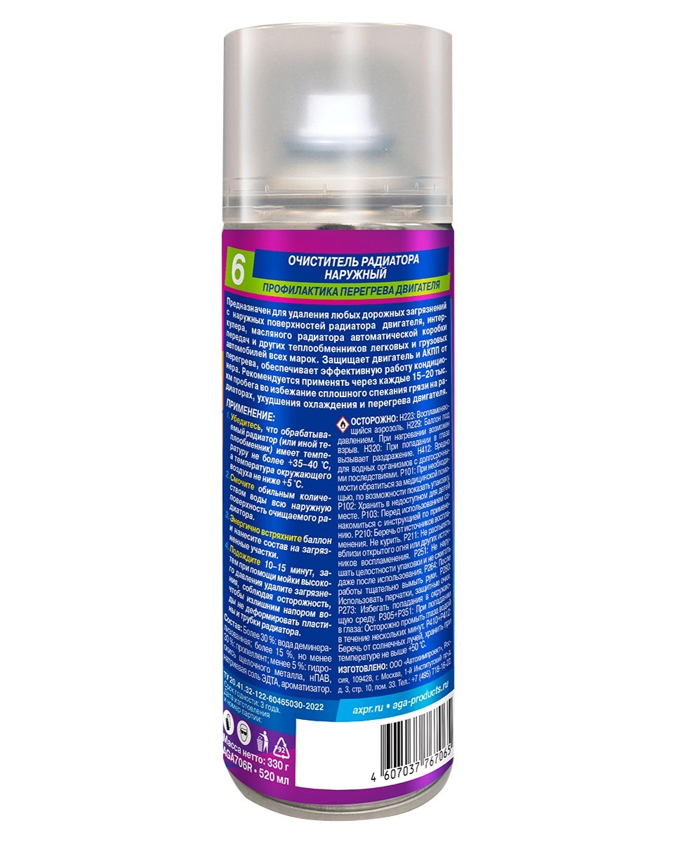 Очиститель радиатора наружный AGA706R. Предназначен для удаления любых дорожных загрязнений с наружных поверхностей радиатора двигателя, интеркулера, масляного радиатора автоматической коробки передач и других теплообменников легковых и грузовых автомобилей всех марок. Защищает двигатель и АКПП от перегрева, обеспечивает эффективную работу кондиционера. Рекомендуется применять через каждые 15-20 тыс. км пробега во избежание сплошного спекания грязи на радиаторах, ухудшения охлаждения, нарушения работы и перегрева двигателя. ПРИМЕНЕНИЕ: Убедитесь, что обрабатываемый радиатор (или иной теплообменник) имеет температуру не более +35-40, а температура окружающего воздуха не ниже +5. Смочите обильным количеством воды всю наружную поверхность очищаемого радиатора. Энергично встряхните баллон и нанесите состав на загрязненные участки. Подождите 10-15 минут, затем при помощи мойки высокого давления удалите загрязнения, соблюдая осторожность, чтобы излишним напором воды не деформировать пластины и трубки радиатора.