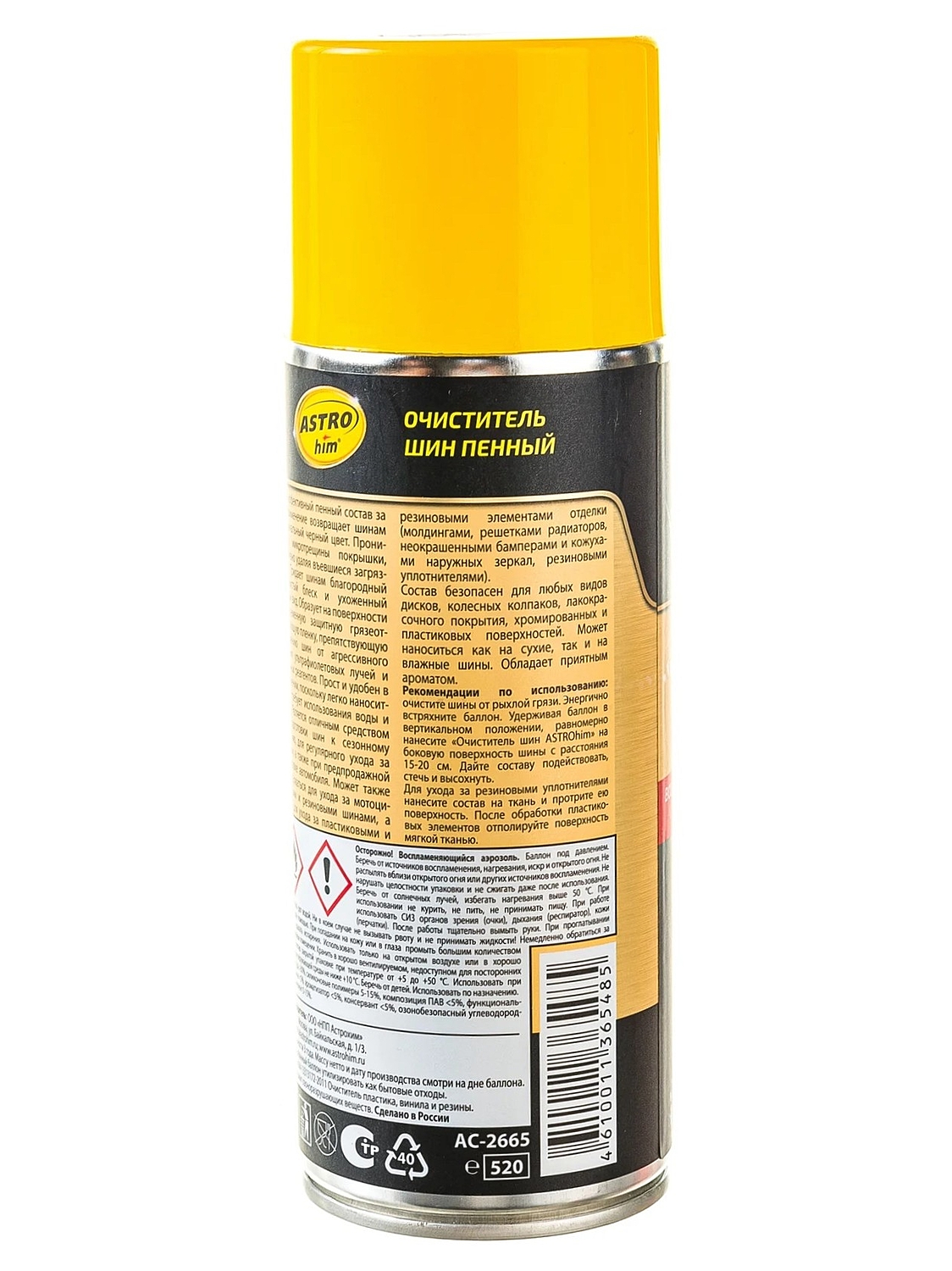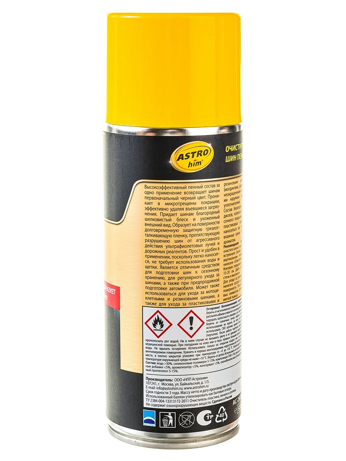 В процессе эксплуатации автомобиля в структуре и микротрещинах покрышек скапливаются загрязнения, которые, в конечном счете, придают шинам серый цвет и ускоряют процесс старения. Очиститель шин пенный ASTROhim возвращает шинам первоначальный черный цвет за одно применение. Высокоэффективный пенный состав проникает в микротрещины покрышки, эффективно удаляя въевшиеся загрязнения из структуры и микротрещин покрышки.
