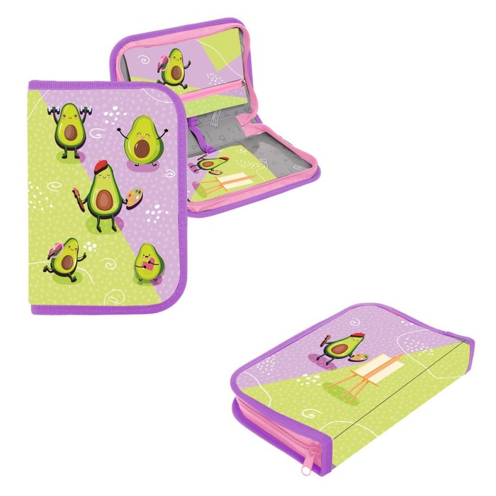 Пенал 1 секция 140 х 210 х 40 мм, откидной карман и косметичка, тканевый, Calligrata Content "Авокадо стайл"