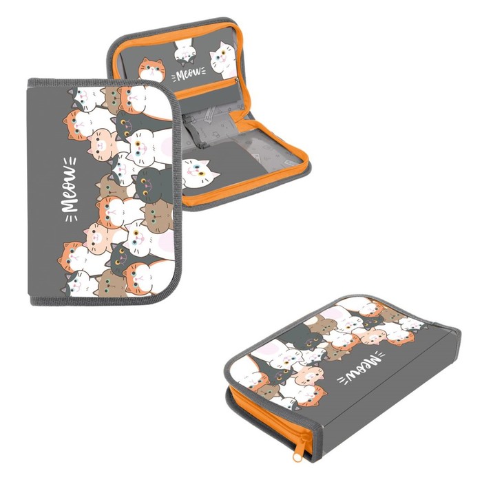 Пенал 1 секция 140 х 210 х 40 мм, откидной карман и косметичка, тканевый, Calligrata Content "Коты"