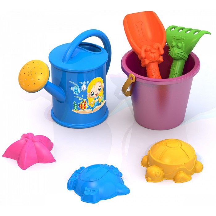 Комплектация: 3 формочки, совок, грабли, ведро, лейка
