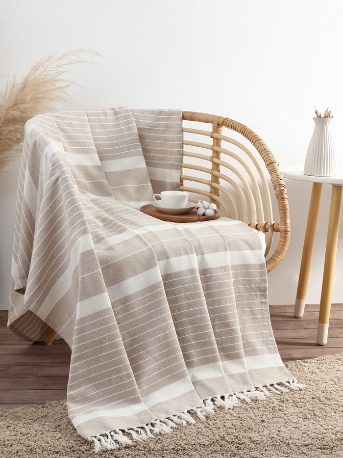Бежевый хлопковый плед среднего размера 130×160 см с аккуратными декоративными кисточками станет гармоничным элементом интерьера и обеспечит уют в любой комнате. Лёгкая текстильная фактура с полосатым узором привносит в пространство спокойствие и тепло, создавая приятную атмосферу для отдыха. Такой плед отличается универсальностью и подходит для использования в любое время года, оставаясь комфортным и практичным дополнением вашего дома. Благодаря компактному размеру изделие легко брать с собой для поездок или использовать как дополнительный источник тепла дома или на веранде.