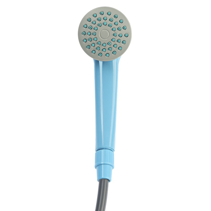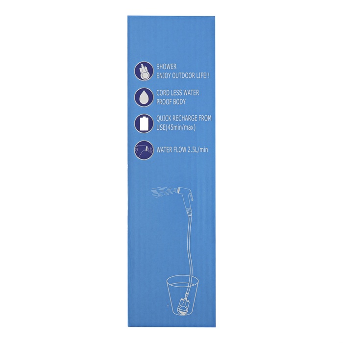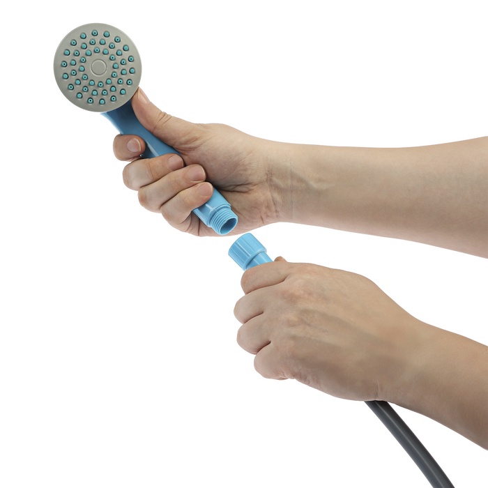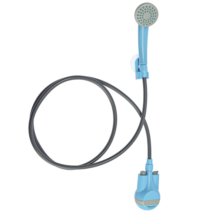 Портативный походный душ с USB-помпой, лейка, шланг 2.5 м, держатель, крючок — автономное устройство для приема душа в походных условиях, на пляже, даче или в кемпинге. Работает от USB-порта (power bank, автомобильное зарядное устройство). Погружная помпа подает воду из емкости (ведро, бак) через шланг к лейке. В комплекте держатель и крючок для фиксации лейки. Длина шланга 2.5 м.