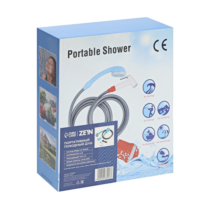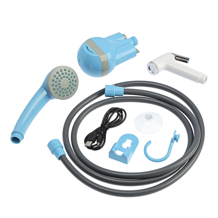 Портативный походный душ ZEIN: лейка, шланг, помпа с USB-кабелем, держатель, крючок
