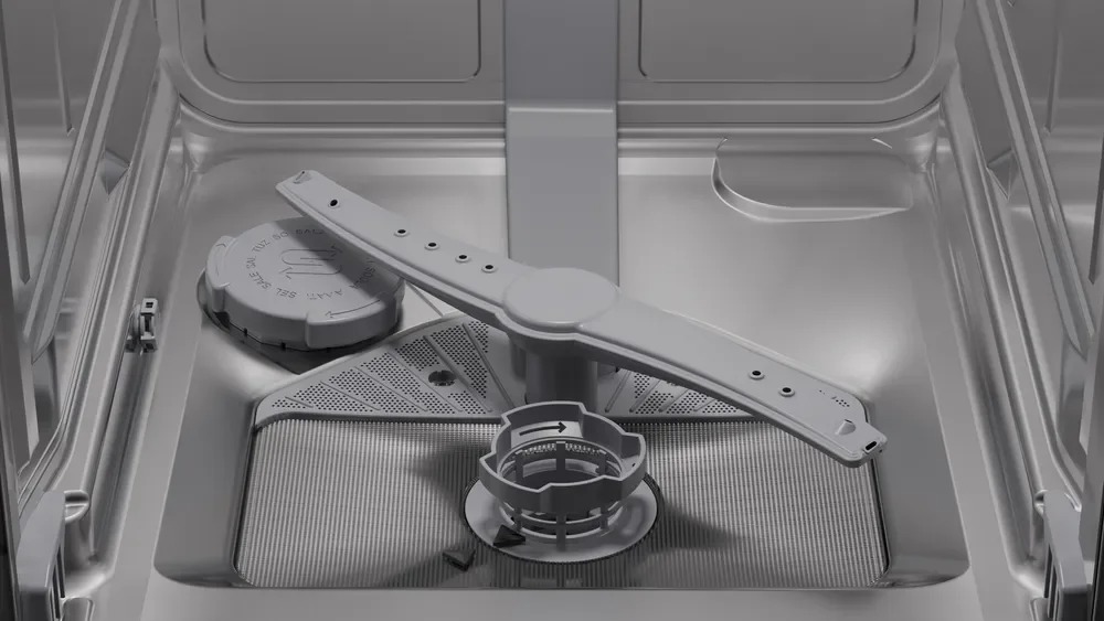 Интерьер представлен тремя корзинами, где верхний уровень легко переставляется по высоте благодаря системе Rackmatic-3, что упрощает загрузку объемных кастрюль или высоких бокалов. Верхний корзин оснащен полочкой для чашек, в нижнем расположены две складные направляющие для тарелок, что позволяет варьировать конфигурацию под разные наборы посуды. Пять уровней распределения воды обеспечивают равномерное орошение, а система защиты стекла бережно относится к деликатным бокалам, уменьшая риск повреждений при мойке.