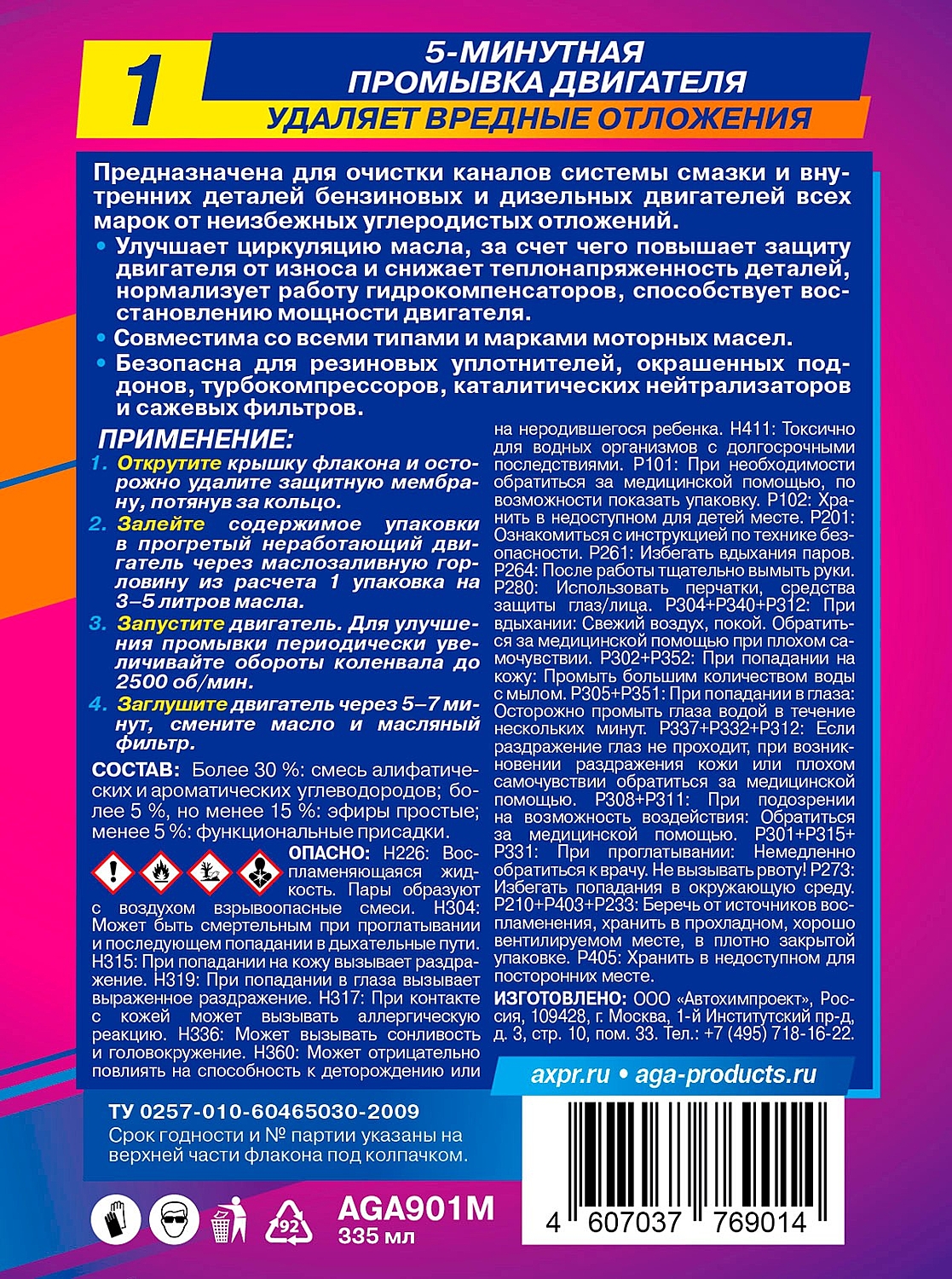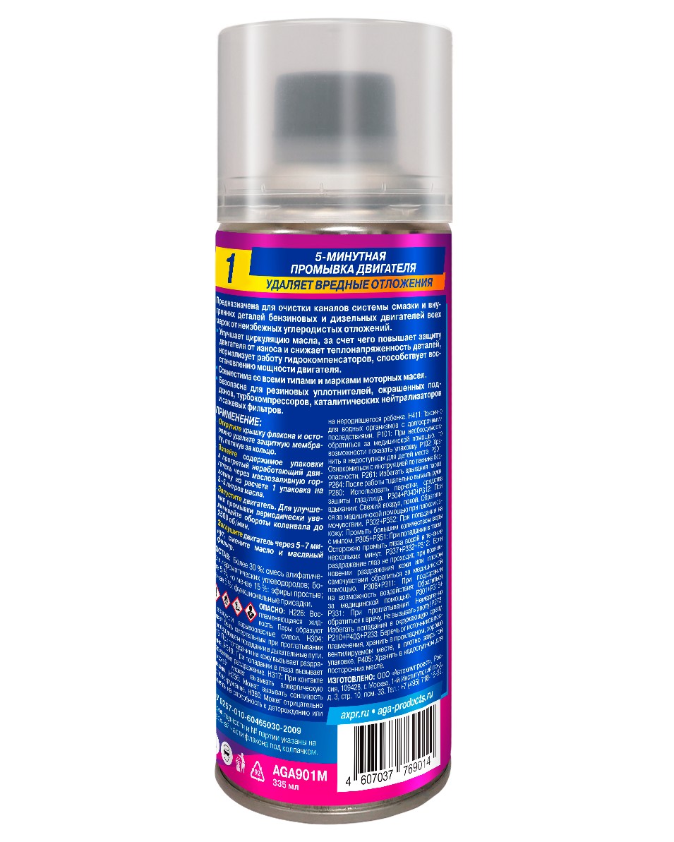 5-минутная промывка двигателя AGA901M. Удаляет вредные отложения! Подходит для бензиновых и дизельных двигателей всех марок. Предназначена для очистки каналов системы смазки и внутренних деталей бензиновых и дизельных двигателей всех марок от неизбежных углеродистых отложений. Улучшает циркуляцию масла, за счет чего повышает защиту двигателя от износа и снижает теплонапряженность деталей, нормализует работу гидрокомпенсаторов, способствует восстановлению мощности двигателя. Совместима со всеми типами и марками моторных масел. Безопасна для резиновых уплотнителей, окрашенных поддонов, турбокомпрессоров, каталитических нейтрализаторов и сажевых фильтров. ПРИМЕНЕНИЕ: Открутите крышку флакона и осторожно удалите защитную мембрану, потянув за кольцо. Залейте содержимое упаковки в прогретый неработающий двигатель через маслозаливную горловину из расчета 1 упаковка на 3-5 литров масла. Запустите двигатель. Для улучшения промывки периодически увеличивайте обороты коленвала до 2500 об/мин. Заглушите двигатель через 5-7 минут, смените масло и масляный фильтр.