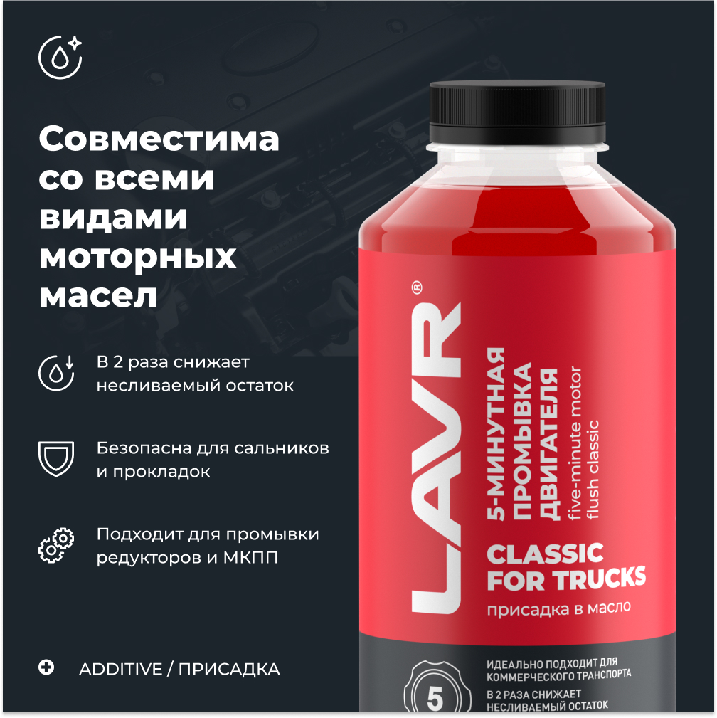 Промывка двигателя 5-минутная Классическая для коммерческого транспорта LAVR 1 л Ln1004. 5-минутная промывка двигателя для коммерческого транспорта очищает систему смазки от отложений, образовавшихся в процессе эксплуатации. Обеспечивает диспергирующее свойство масла и безопасно выводит загрязнения, не забивая маслоприемник и каналы. Препятствует закоксовыванию ЦПГ, освобождает все внутренние гидроприводы, увеличивает срок службы масла на 10-20% за счет уменьшения несливаемого остатка и повышает эффективность смазки. Промывка безопасна для резиновых деталей и совместима со всеми видами моторных масел. Подходит для систем смазки всех типов бензиновых и дизельных двигателей большого объема легковых и грузовых автомобилей, строительной и сельскохозяйственной техники. Эффективно и безопасно удаляет продукты разложения масла и износа двигателя. Содержит корректор вязкости и позволяет безопасно промыть двигатели даже при разжижении масла топливом. Препятствует закоксовыванию поршневых колец. Сокращает угар масла. Предотвращает залипание гидрокомпенсаторов и гидронатяжителей. Увеличивает срок службы нового масла на 10-20 % за счет уменьшения несливаемого остатка в системе более чем в 2 раза. Абсолютно безопасен для резиновых уплотнителей, сальников, манжет и полностью совместим со всеми видами моторных масел. Может использоваться для промывки редукторов и механических коробок передач. Промывка двигателя 5-минутная Классическая предназначена как для самостоятельного использования, так и в качестве сервисного средства. Рекомендуется применять перед каждой заменой масла, после применения раскоксовки и при переходе на другой тип масла. 1. Прогреть двигатель до рабочей температуры. 2. Залить состав в маслозаливную горловину и запустить двигатель. 3. Дать поработать на холостом ходу в течение 5 минут. Движение на автомобиле запрещено! 4. Заглушить двигатель и слить отработанное масло. 5. Заменить масляный фильтр и залить новое масло.