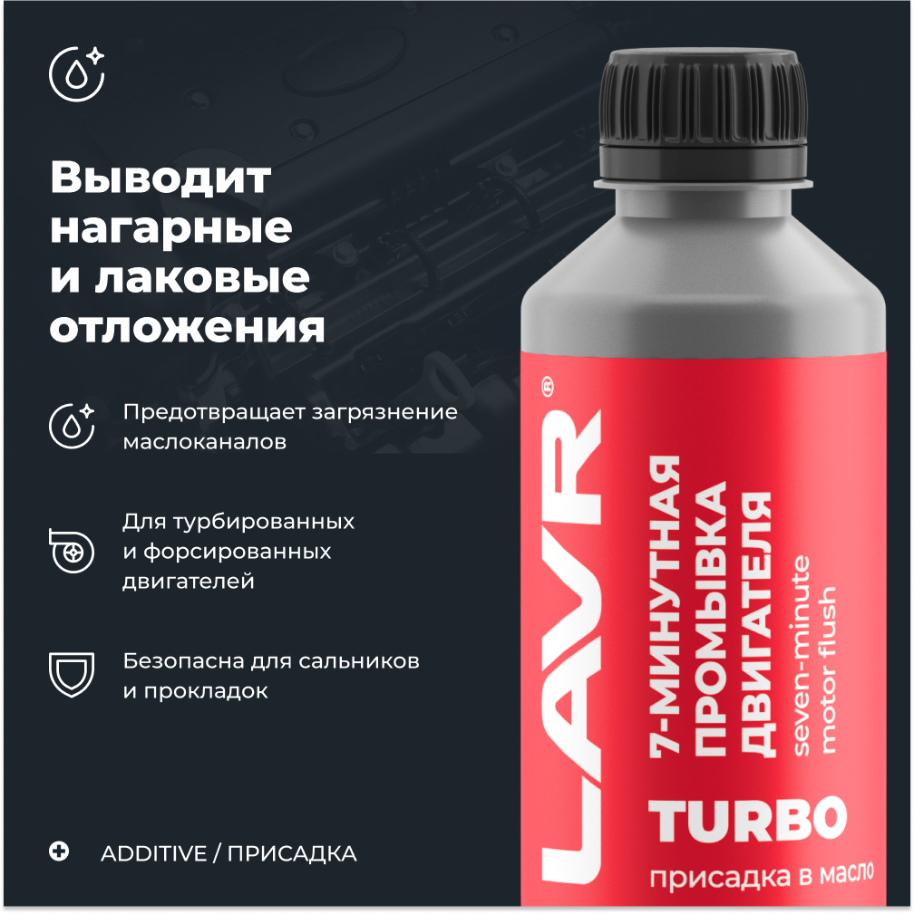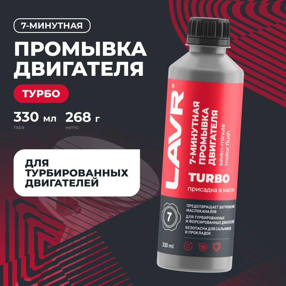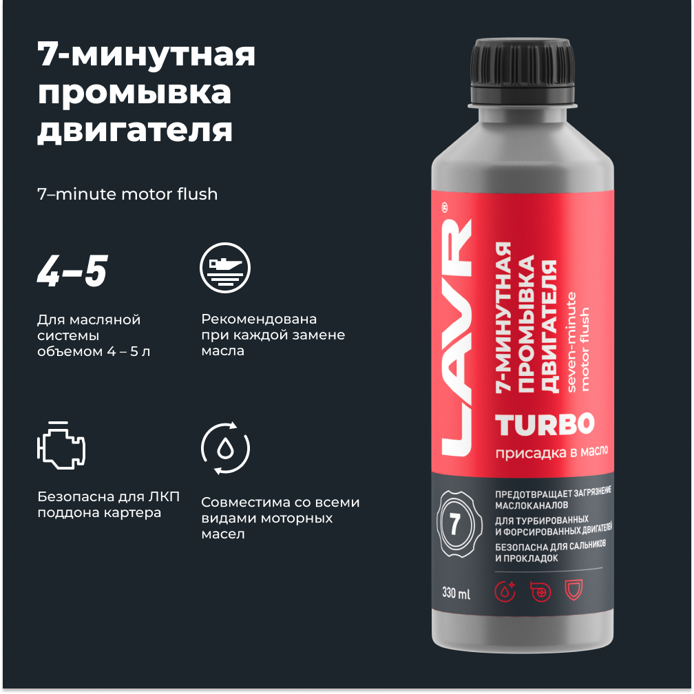 7-минутная промывка масляной системы двигателя LAVR 330 мл Ln1002N. 7-минутная промывка двигателя на основе запатентованного комплекса компонентов LAVR TOS/DET растворяет отложения и выводит их из масляной системы двигателей сложной конструкции. Добавляется в моторное масло перед его заменой. За 7 минут размягчает и выводит загрязнения, освобождает все внутренние гидроприводы, увеличивает срок службы масла на 10-20% за счет уменьшения несливаемого остатка, препятствует закоксовыванию ЦПГ и повышает эффективность смазки. Состав безопасен для резиновых деталей и совместим со всеми видами моторных масел. Применяется для систем смазки всех типов бензиновых и дизельных двигателей, в том числе для V-образных, оппозитных, турбированных или форсированных моторов. Расщепляет и выводит нагарные и лаковые отложения, продукты распада масла, частицы износа механизмов. Очищает гидрокомпенсаторы и гидронатяжители. Увеличивает срок службы масла на 10-20% за счет уменьшения несливаемого остатка более чем в два раза. Снижает риск закоксовывания ЦПГ при регулярном применении. Не забивает маслоприемник. Состав содержит запатентованный комплекс LAVR TOS/DET. Не содержит растворителей и безопасен для РТИ и ЛКП поддона картера. Совместим со всеми видами моторных масел. Одна упаковка рассчитана на промывку масляной системы объемом 4-5 л. Рекомендован при каждой замене масла, смене типа масла и превышении сервисных интервалов. Рекомендован для турбированных, форсированных с пробегом более 20 000 км. Промывка двигателя 7-минутная предназначена как для самостоятельного использования, так и в качестве сервисного средства. Рекомендуется применять перед каждой заменой масла, после применения раскоксовки и при переходе на другой тип масла.