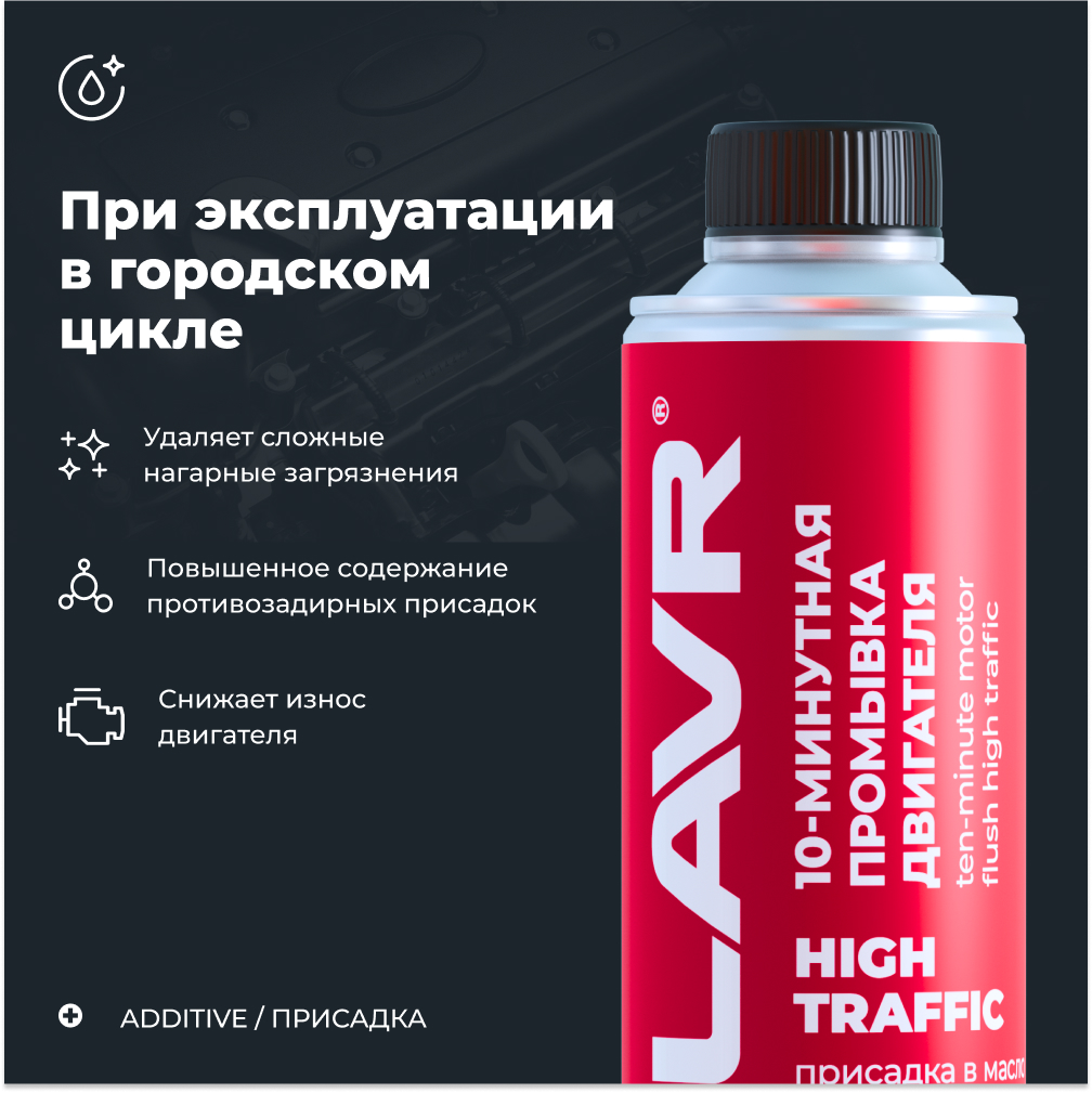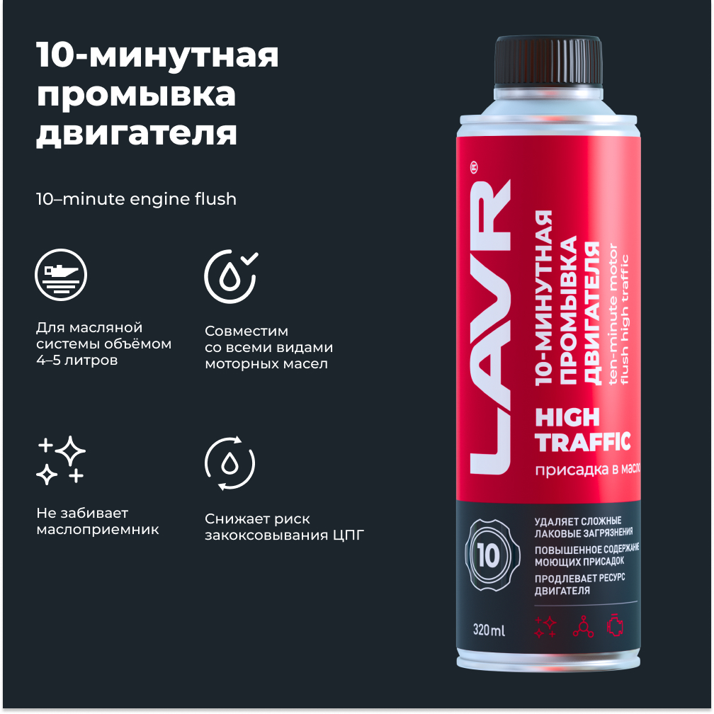Промывка двигателя 10-минутная High Traffic LAVR, 320 мл / Ln1009. 10-минутная промывка двигателя High Traffic очищает систему смазки двигателей, эксплуатируемых в условиях высокого городского трафика. Моющие и противозадирные присадки в составе комплексно очищают масляную систему, повышают эффективность смазки, препятствуют закоксовыванию поршневых колец в условиях жесткой эксплуатации. Состав освобождает все внутренние гидроприводы, увеличивает срок службы масла на 10-20% за счет уменьшения несливаемого остатка. Безопасен для резиновых деталей и совместим со всеми видами моторных масел. Подходит для систем смазки всех типов бензиновых и дизельных двигателей. Расщепляет и выводит нагарные и лаковые отложения, продукты распада масла, частицы износа механизмов. Очищает гидрокомпенсаторы и гидронатяжители. Увеличивает срок службы масла на 10-20% за счет уменьшения несливаемого остатка более чем в два раза. Снижает риск закоксовывания ЦПГ при регулярном применении. Не забивает маслоприемник. Состав содержит противозадирные и очищающие компоненты. Не содержит растворителей и безопасен для РТИ и ЛКП поддона картера. Совместим со всеми видами моторных масел Одна упаковка рассчитана на промывку масляной системы объемом 4-5 л. Рекомендован при каждой замене масла, смене типа масла и превышении межсервисных интервалов. Рекомендован двигателей с пробегом более 20 000 км в условиях жесткой эксплуатации. 10-минутная промывка двигателя High Traffic предназначена как для самостоятельного использования, так и в качестве сервисного средства. Рекомендуется применять перед каждой заменой масла, после раскоксовки и при переходе на другой тип масла. 1. Прогреть двигатель до рабочей температуры, затем заглушить. 2. Залить препарат в маслозаливную горловину и запустить двигатель. 3. Дать поработать на холостом ходу в течение 10 минут. 4. Движение на автомобиле запрещено! 5. Заглушить двигатель и слить отработанное масло. 6. Заменить масляный фильтр и залить новое масло.