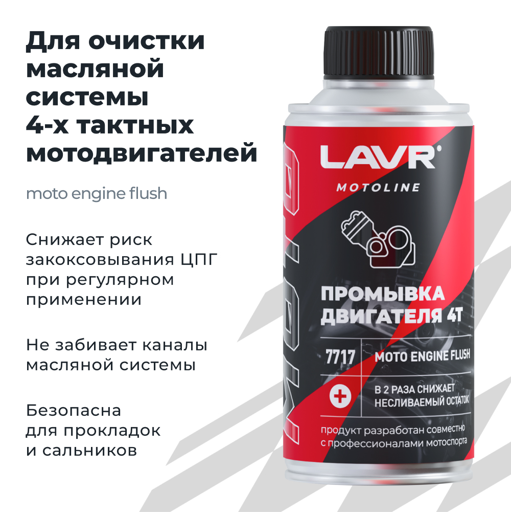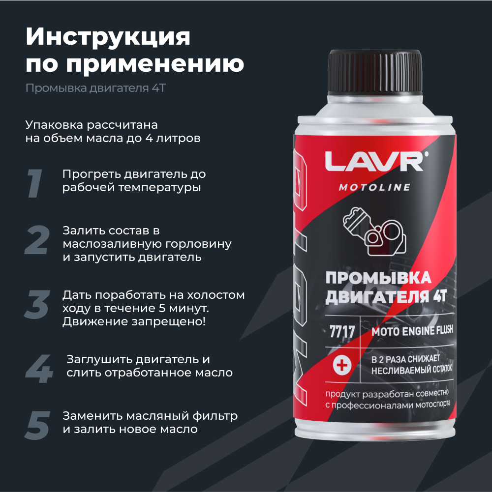 Промывка двигателя мотоцикла 4Т LAVR 190 мл Ln7717. Специализированный состав для очистки масляных систем 4-х тактных двигателей мотоциклов, квадроциклов, гидроциклов и снегоходов, в том числе оснащенных каталитическим нейтрализатором. Комплексно воздействует на систему смазки: способствует максимальному сливу отработавшего масла и обеспечивает вывод загрязнений, образовавшихся в двигателе в процессе эксплуатации. Позволяет поддерживать систему смазки в чистоте при систематическом использовании. Послойно размягчает и выводит нагарные и лаковые отложения, частицы износа шестерен, фрикционов и масляный шлам. Подходит для двигателей с "мокрым" сцеплением. Увеличивает срок службы масла на 10-20% за счет уменьшения несливаемого остатка более чем в два раза. Снижает риск закоксовывания ЦПГ при регулярном применении. Не забивает каналы масляной системы и безопасна для прокладок и сальников. Не повреждает лаковые обмотки генератора, фрикционные накладки сцепления и их клей. Совместима со всеми видами моторных масел для 4Т двигателей. Упаковка рассчитана на объем масла до 4 литров. 1. Прогреть двигатель до рабочей температуры. 2. Залить состав в маслозаливную горловину и запустить двигатель. 3. Дать поработать на холостом ходу в течение 5 минут. 4. ДВИЖЕНИЕ ЗАПРЕЩЕНО! 5. Заглушить двигатель и слить отработанное масло. 6. Заменить масляный фильтр и залить новое масло. Рекомендуется применять при каждой замене масла.