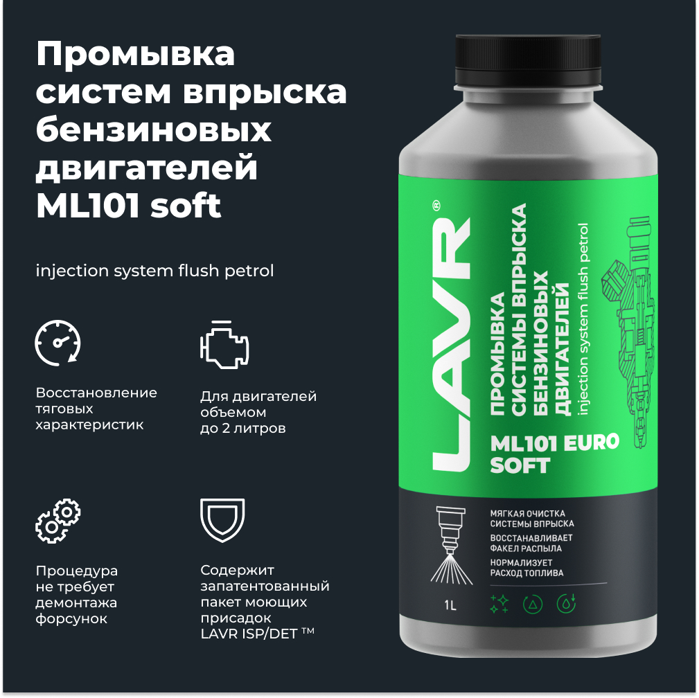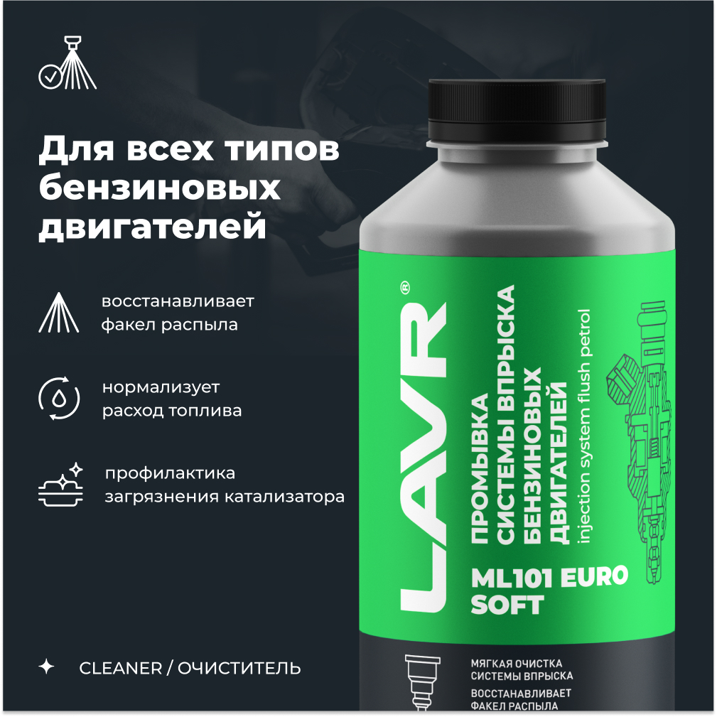 Промывка инжекторной системы бензинового двигателя ML101 Euro LAVR, 1 л / Ln2007. ML101 Euro - средство для безразборной промывки бензиновых систем впрыска с помощью пневматической станции. Запатентованный пакет моющих присадок LAVR ISP/DET устраняет до 100% загрязнений в форсунках, восстанавливает факел распыла инжекторов. Не требует замены масла и свечей зажигания. Средство совместимо с любыми пневматическими станциями, подходит для бензиновых двигателей с электронными системами впрыска любого типа. Восстанавливает факел распыла форсунок. Уменьшает расход топлива. Устраняет неровную работу двигателя на холостых и малых оборотах. Облегчает холодный запуск. Устраняет рывки при разгоне, замедленную реакцию на нажатие педали акселератора и дымность двигателя, вызванные загрязнением топливной системы. Понижает токсичность выхлопных газов (CO и СН). Содержит запатентованный пакет моющих присадок LAVR ISP/DET. Безопасен для катализатора и свечей зажигания. Расход рабочей жидкости составляет около 1 л на двигатель объемом до 2 л. Проведение процедуры не требует демонтажа форсунок. Не требует замены масла и свечей. Состав безопасен для любых видов промывочных станций. Подходит для всех типов систем впрыска бензиновых двигателей. Перед применением прогреть до комнатной температуры. Подходит как для самостоятельного использования, так и в качестве сервисного средства. 1. Тщательно встряхнуть. 2. Подключить промывочную станцию. 3. Залить препарат, выставить давление 3 атм. 4. Запустить двигатель и дать поработать на холостом ходу в течение 10-15 минут. 5. Заглушить двигатель на 10-15 минут для растворения отложений. 6. Запустить двигатель. 7. Выработать жидкость, периодически плавно повышая обороты до 1500-2500 об/мин. Не заливать в топливный бак.