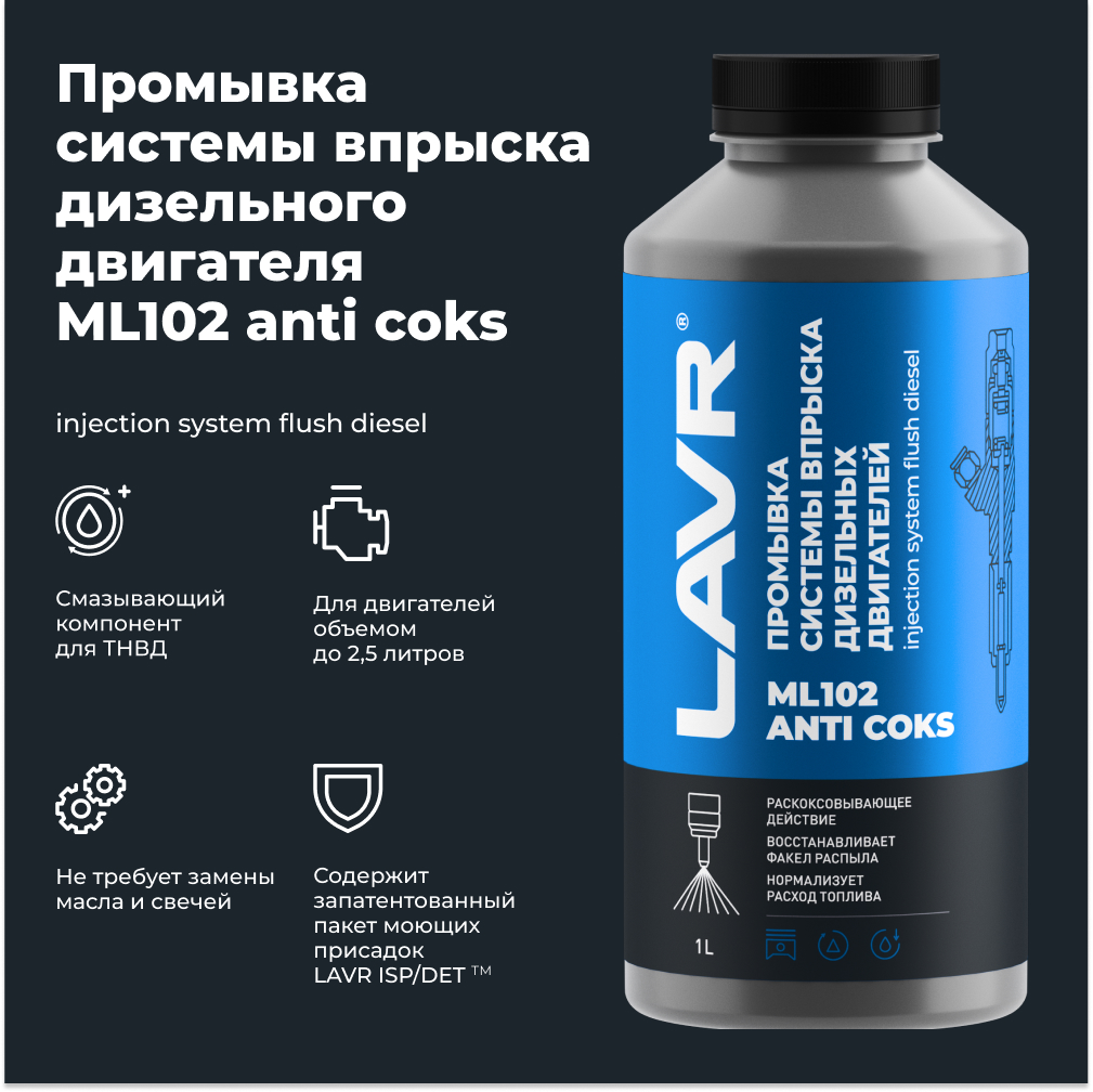 Промывка инжекторной системы дизельного двигателя ML102 LAVR, 1 л / Ln2002. ML102 - промывка с раскоксовывающим эффектом для безразборной очистки дизельных систем впрыска. Запатентованный пакет моющих присадок LAVR DSP/DET восстанавливает факел распыла форсунок, устраняет нагар с днищ поршней и поршневых колец. Промывка предназначена для применения со специальными пневматическими станциями и подходит для всех типов систем впрыска: Сommon Rail, насос-форсунок и прочих. Замена масла и свечей после промывки не требуется. Подходит для применения в дизельных двигателях со всеми типами систем впрыска. Средство используется с промывочной станцией. Восстанавливает факел распыла форсунок. Раскоксовывает днища поршней, компрессионные и маслосъемные кольца. Уменьшает расход топлива. Устраняет неровную работу двигателя на холостых и малых оборотах. Облегчает холодный запуск. Устраняет рывки при разгоне, замедленную реакцию на нажатие педали акселератора и дымность двигателя, вызванные загрязнением топливной системы. Понижает токсичность выхлопных газов (CO и СН). Безопасен для катализатора и свечей зажигания. Содержит запатентованный пакет моющих присадок LAVR DSP/DET. Содержит смазывающее компоненты для ТНВД. Расход рабочей жидкости составляет около 1 л на двигатель объемом до 2,5 л. Проведение процедуры не требует демонтажа форсунок. Не требует замены масла и свечей. Состав безопасен для любых видов промывочных станций. Подходит для всех типов систем впрыска дизельных двигателей. Перед применением прогреть до комнатной температуры. Подходит как для самостоятельного использования, так и в качестве сервисного средства. 1. Тщательно встряхнуть. 2. Подключить промывочную станцию. 3. Залить препарат, выставить давление 3 атм. 4. Запустить двигатель и дать поработать на холостом ходу в течение 10-15 минут. 5. Заглушить двигатель на 10-15 минут для растворения отложений. 6. Запустить двигатель. 7. Выработать жидкость, периодически плавно повышая обороты до 1500-2500 об/мин.