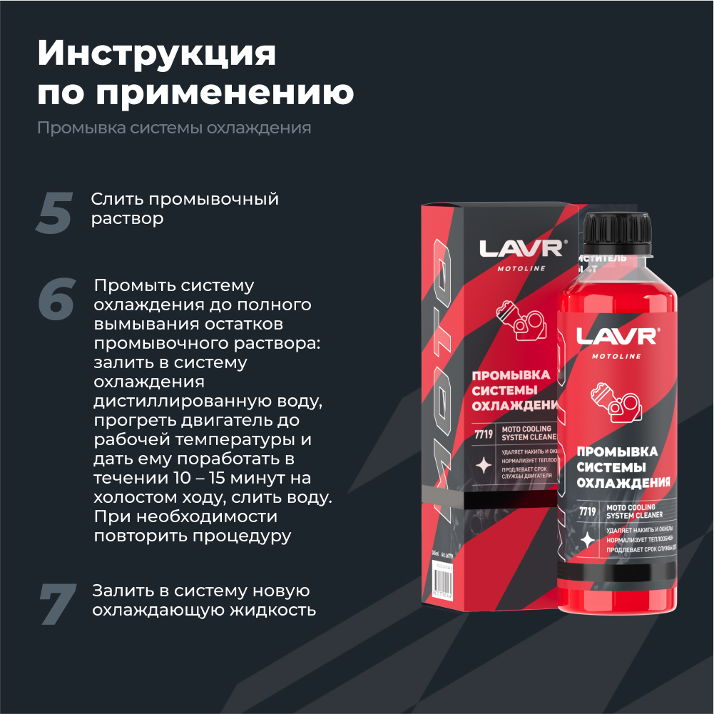 Специальный состав LAVR MOTOLINE Ln7719 для очистки системы охлаждения двигателей мототехники мягко и послойно растворяет и выводит отложения и продукты разложения антифриза из рубашки охлаждения, патрубков, радиатора и помпы. Поддерживает отмытые загрязнения во взвешенном состоянии, не забивая узкие каналы и трубки. Обеспечивает полное удаление загрязнений из системы охлаждения. Восстанавливает нормальный тепловой режим двигателя.