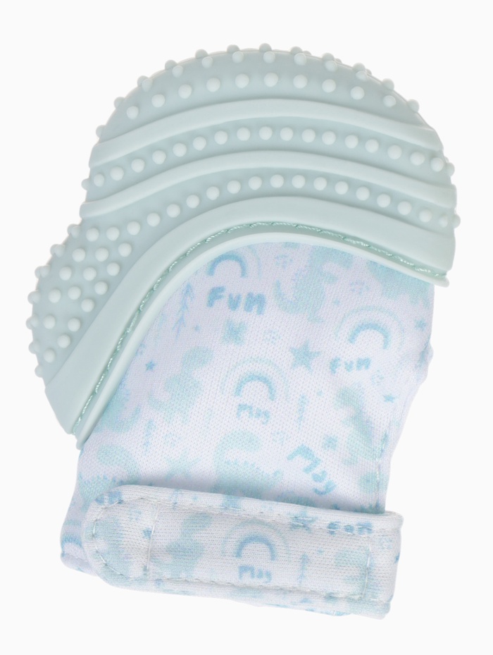Мягкий силикон с рельефной поверхностью помогает бережно массировать дёсны и уменьшать дискомфорт. Текстильная часть приятно шуршит, привлекая внимание малыша и дополнительно вовлекая его в игру. Благодаря липучке варежка хорошо фиксируется на ручке и удобно надевается.