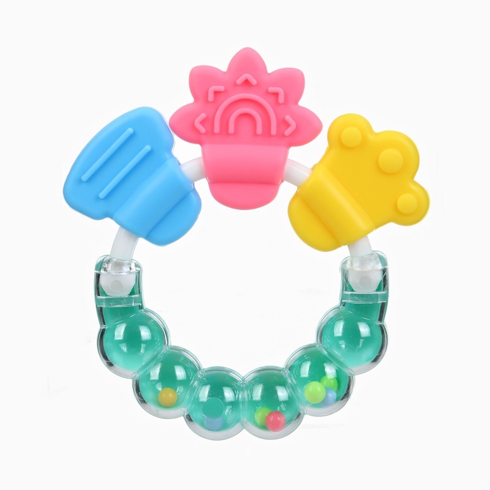 Прорезыватель-погремушка сочетает в себе сразу несколько функций: массаж дёсен, развитие мелкой моторики и координации. Его нежные голубые и зелёные цвета привлекают внимание малыша, а звуковые эффекты поддерживают интерес к игре.