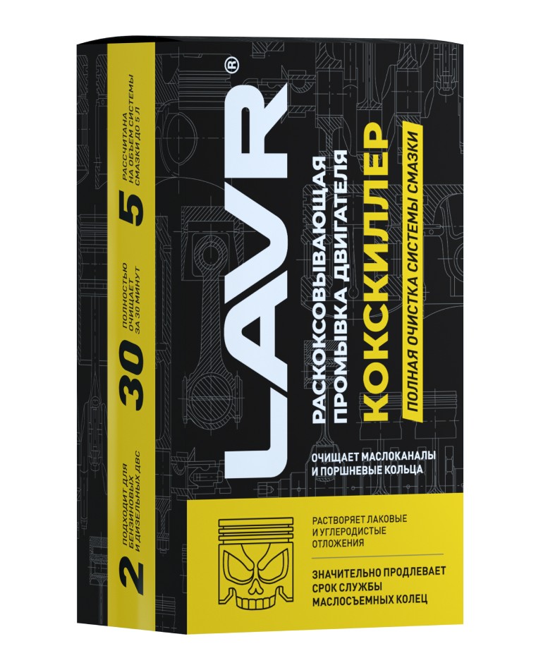 Новый состав LAVR КОКСКИЛЛЕР Ln1020 для очистки сильно загрязненных систем смазки эффективно расщепляет лаковые и углеродистые отложения любой сложности, обеспечивая полную очистку маслоканалов, расширителей маслосъемных колец и гидрокомпенсаторов. Он особенно эффективен для двигателей с пониженными показаниями компрессии, улучшает проходимость маслоканалов и предотвращает образование абразивных нагарных частиц.