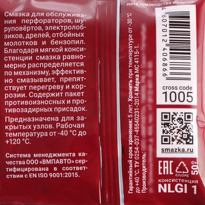 Смазка для обслуживания подшипников, редукторов, звезд, шлицевых соединений в перфораторах, отбойных молотках, триммерах, бензопилах и другом строительном, садовом и бытовом инструментах. Благодаря мягкой консистенции, равномерно распределяется по всему механизму, эффективно смазывая и препятствуя перегреву. Содержит пакет противоизносных и противозадирных присадок, которые увеличивают срок эксплуатации инструмента.
