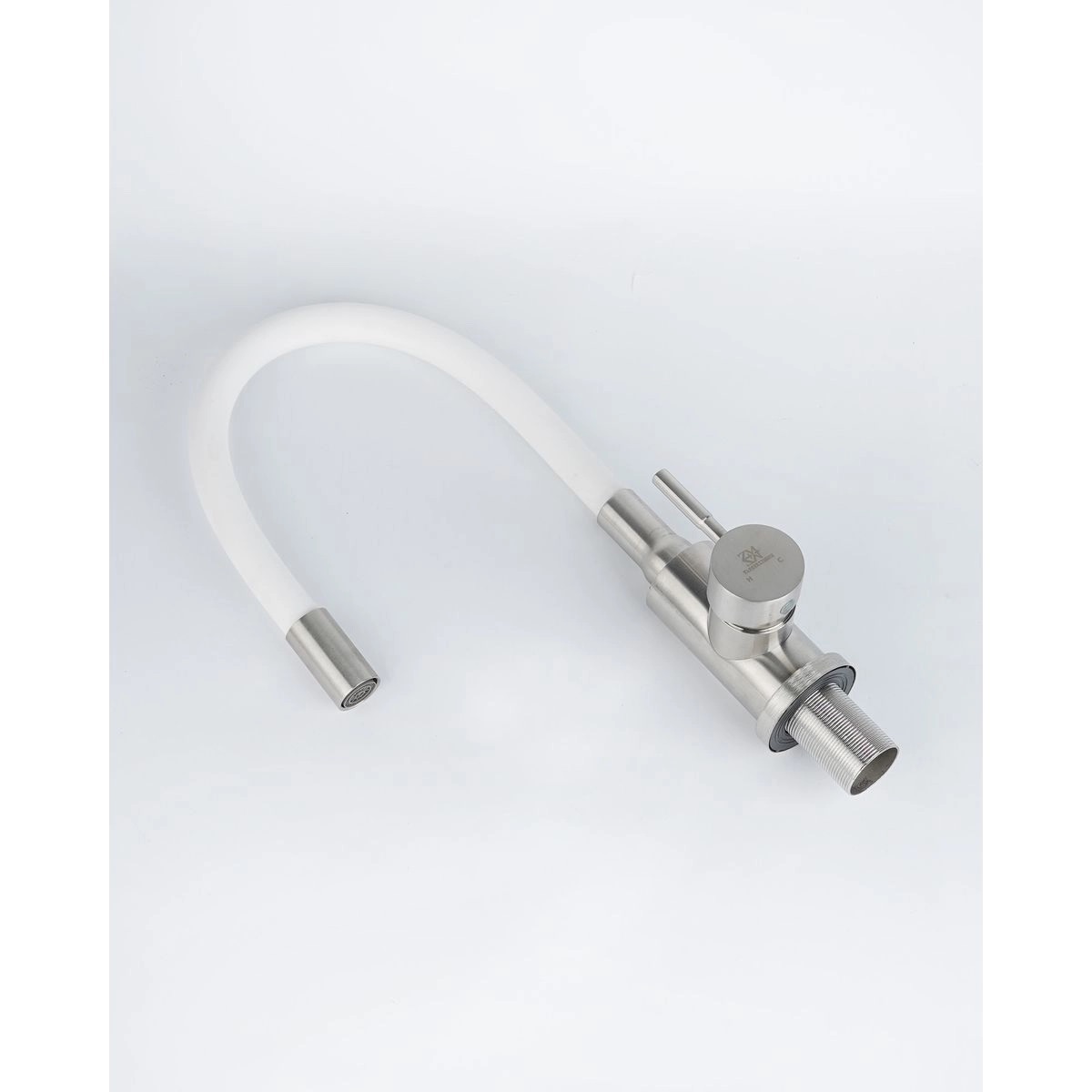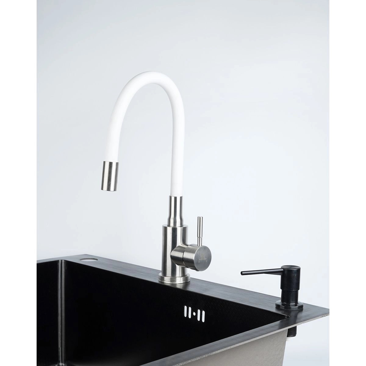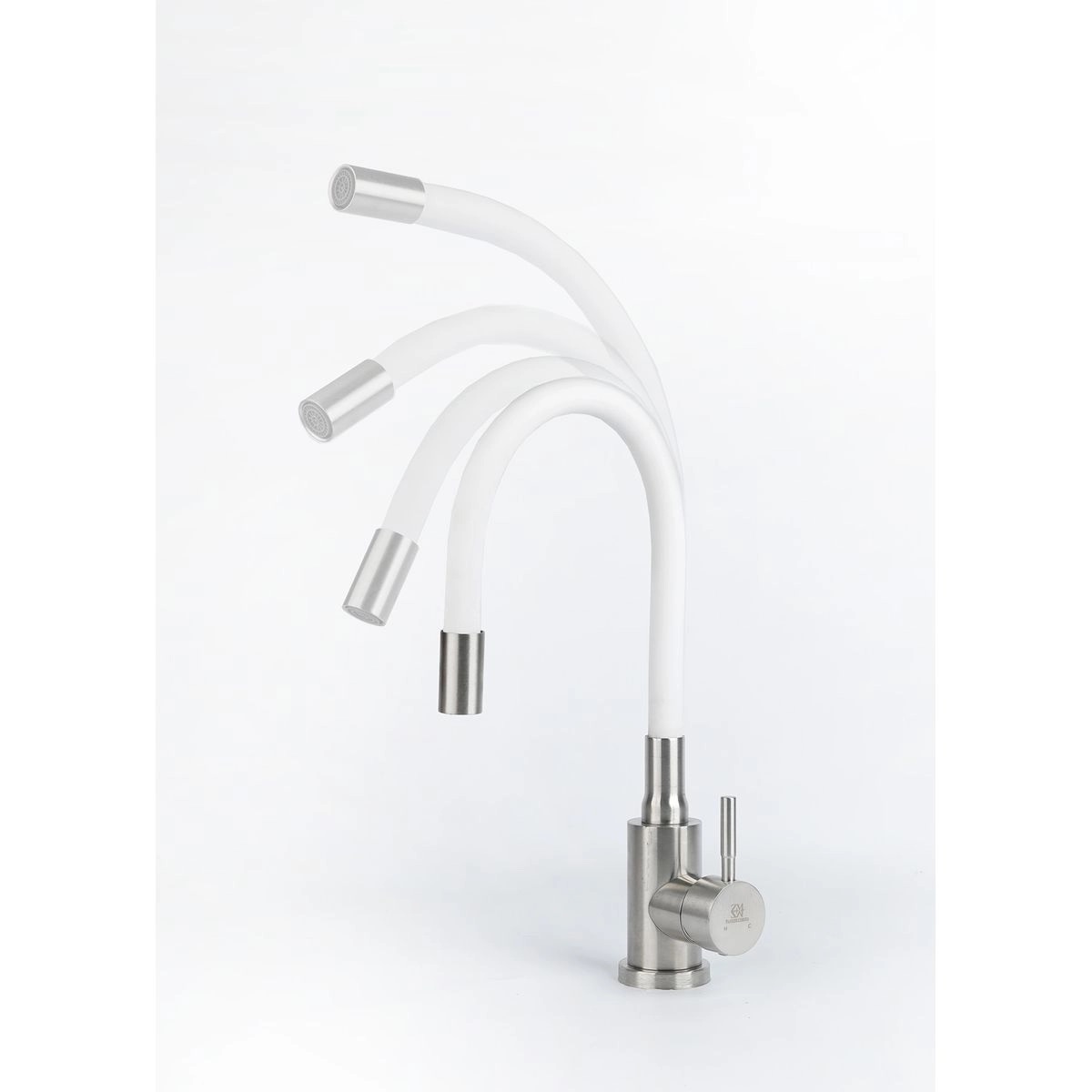 Смеситель для кухни гибкий гусак из нержавеющей стали, цвет сатин с - это высокое качество по доступной цене. Смеситель изготовлен из нержавеющей стали, стойкой к коррозии, резким изменениям давления и перепадам температуры воды. Гибкий белый поворотный гусак позволяет беспроблемно мыть даже самую габаритную посуду. Аэратор насыщает воду воздухом, делая расход минимальным, а саму воду более мягкой. Плавный ход ручки, точность регулировки температуры и напора воды достигается установленным качественным керамическом картриджем. Актуальный дизайн смесителя сделает вашу кухню современной и будет радовать долго время. При выборе смесителя кухонного обратите внимание на его функциональность, качество материалов и сборки, а также на соответствие стилю вашей кухни. Сочетание сатинового и белого цветов может быть отличным выбором, если вы хотите добавить изысканности и современности в интерьер. Габаритные размеры: высота смесителя 330 мм, ширина 40 мм, вылет смесителя 150 мм, высота основания 80 мм, ширина основания 42 мм, ручка 90 мм, толщина излива 17 мм, длина гусака в развернутом виде 470 мм, диаметр аэратора 23 мм, длина подводки 500 мм, диаметр крепления 32мм, высота крепления 55 мм. Приятных покупок!
