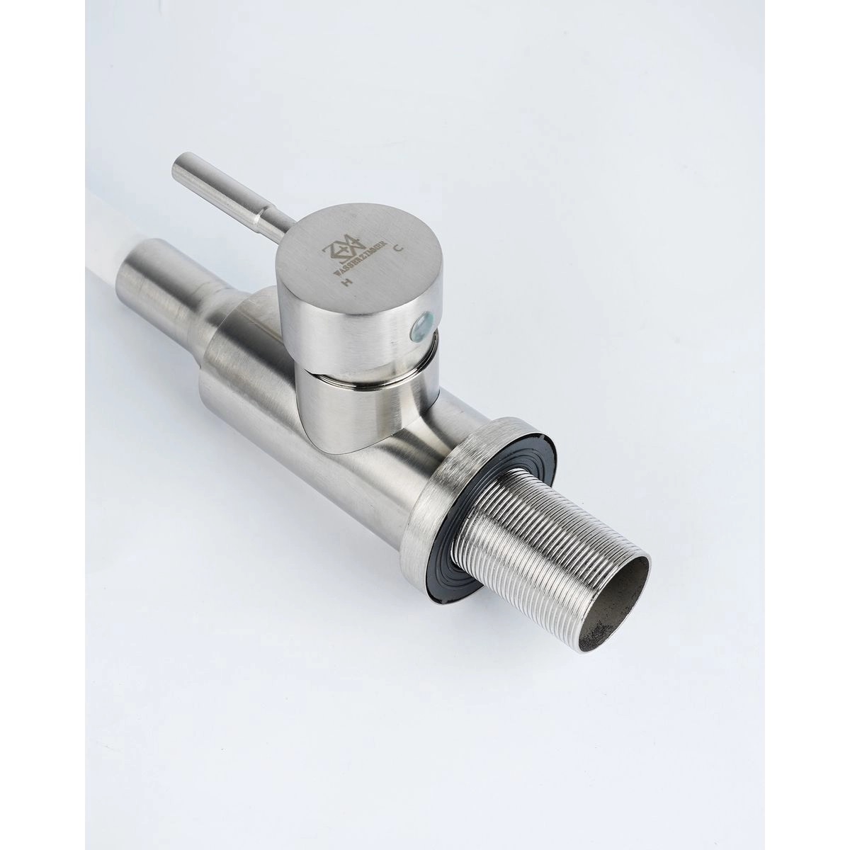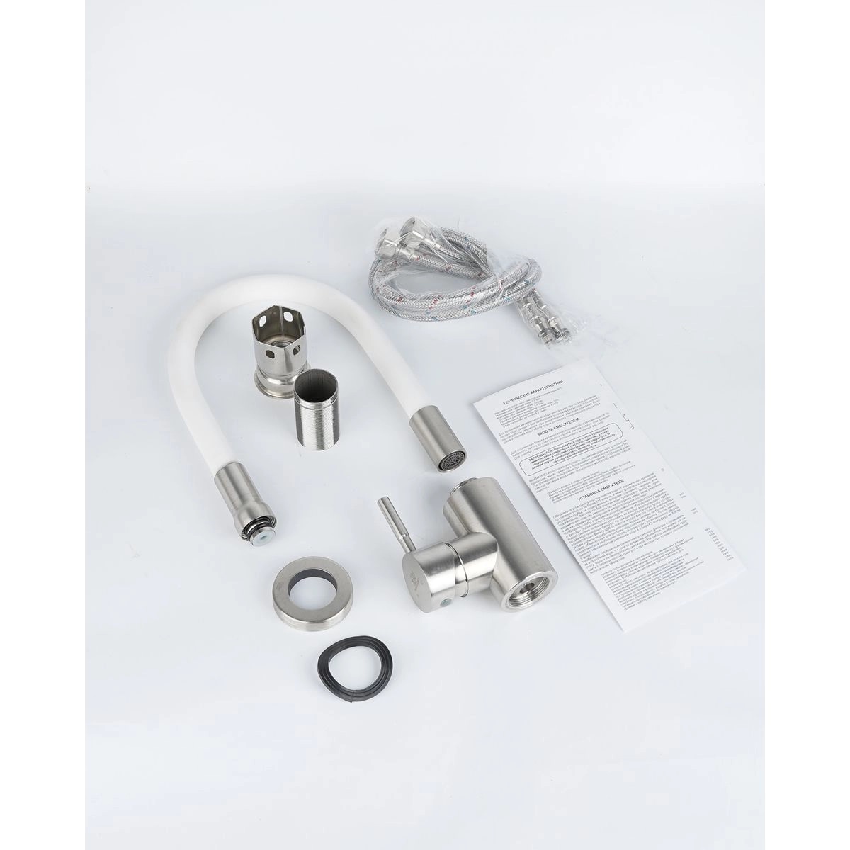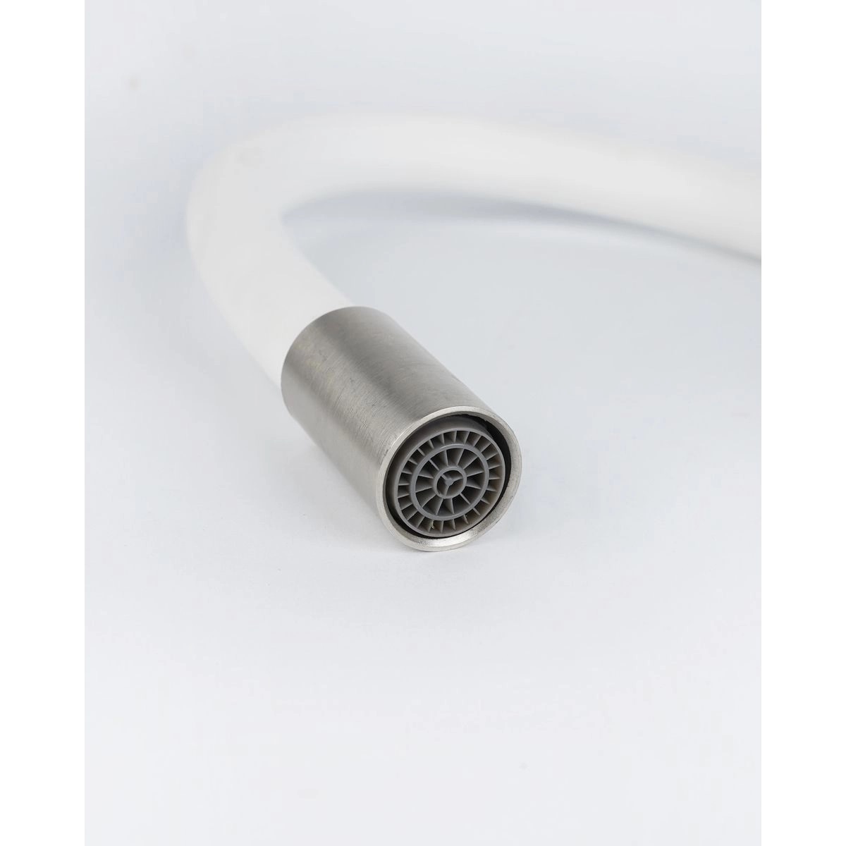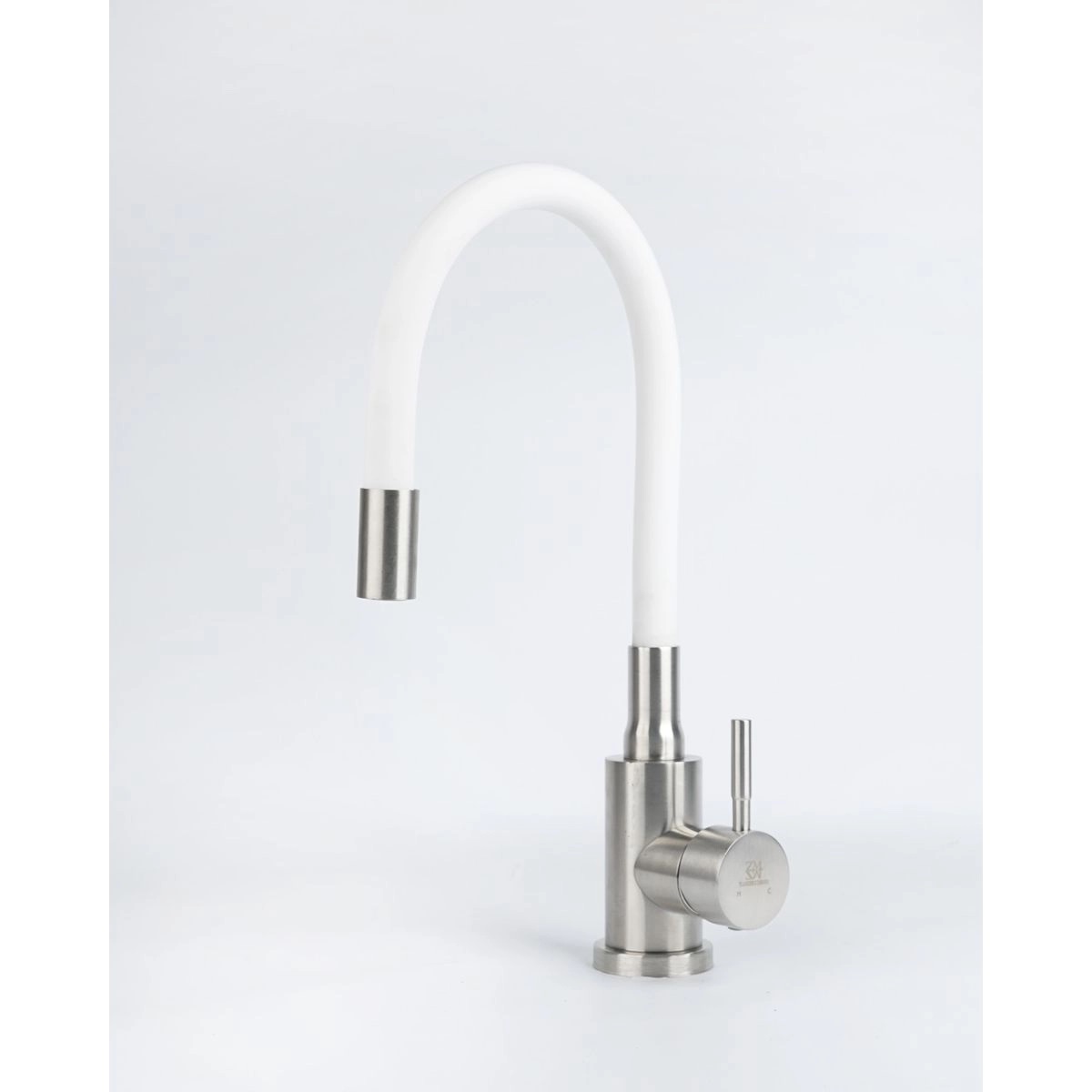Смеситель для кухни гибкий гусак из нержавеющей стали, цвет сатин с - это высокое качество по доступной цене. Смеситель изготовлен из нержавеющей стали, стойкой к коррозии, резким изменениям давления и перепадам температуры воды. Гибкий белый поворотный гусак позволяет беспроблемно мыть даже самую габаритную посуду. Аэратор насыщает воду воздухом, делая расход минимальным, а саму воду более мягкой. Плавный ход ручки, точность регулировки температуры и напора воды достигается установленным качественным керамическом картриджем. Актуальный дизайн смесителя сделает вашу кухню современной и будет радовать долго время. При выборе смесителя кухонного обратите внимание на его функциональность, качество материалов и сборки, а также на соответствие стилю вашей кухни. Сочетание сатинового и белого цветов может быть отличным выбором, если вы хотите добавить изысканности и современности в интерьер. Габаритные размеры: высота смесителя 330 мм, ширина 40 мм, вылет смесителя 150 мм, высота основания 80 мм, ширина основания 42 мм, ручка 90 мм, толщина излива 17 мм, длина гусака в развернутом виде 470 мм, диаметр аэратора 23 мм, длина подводки 500 мм, диаметр крепления 32мм, высота крепления 55 мм. Приятных покупок!