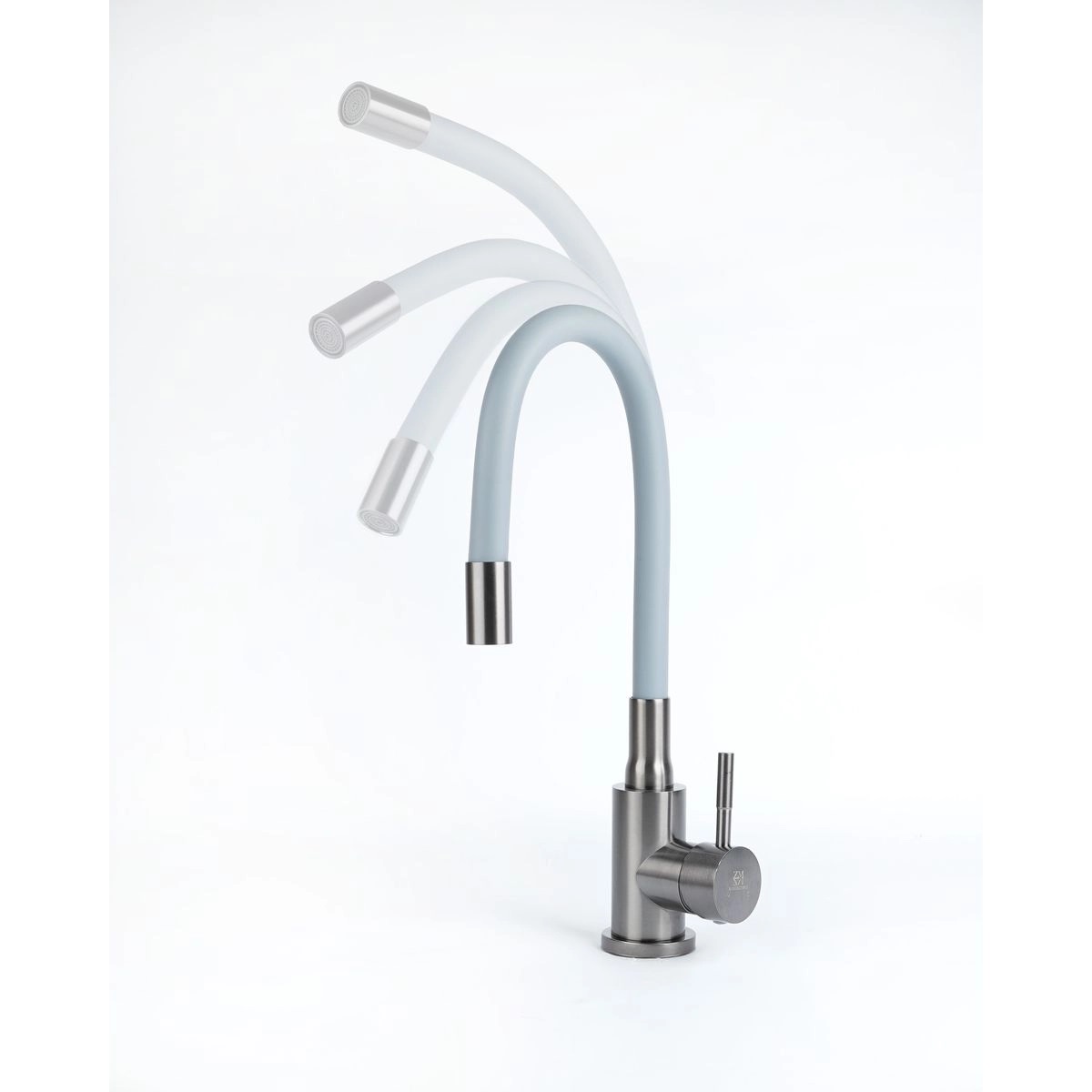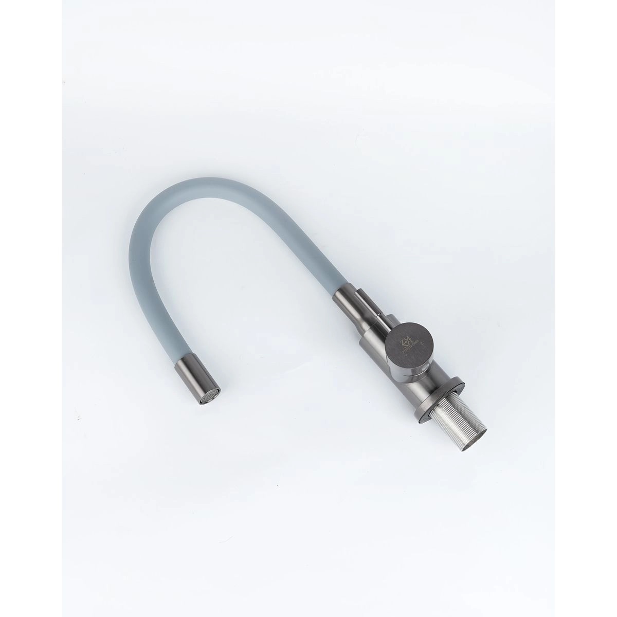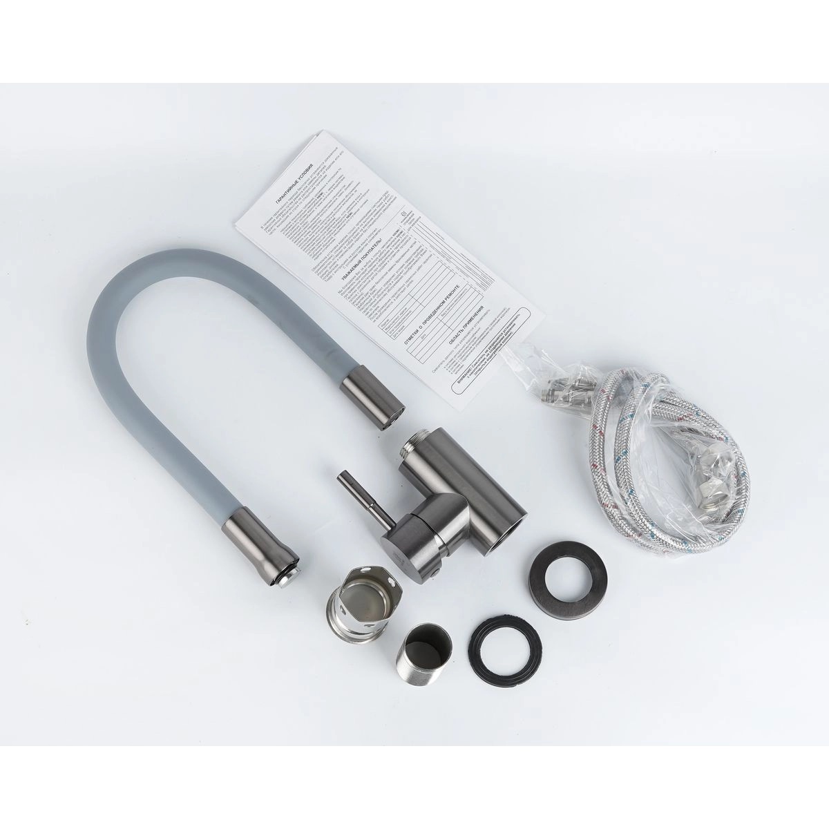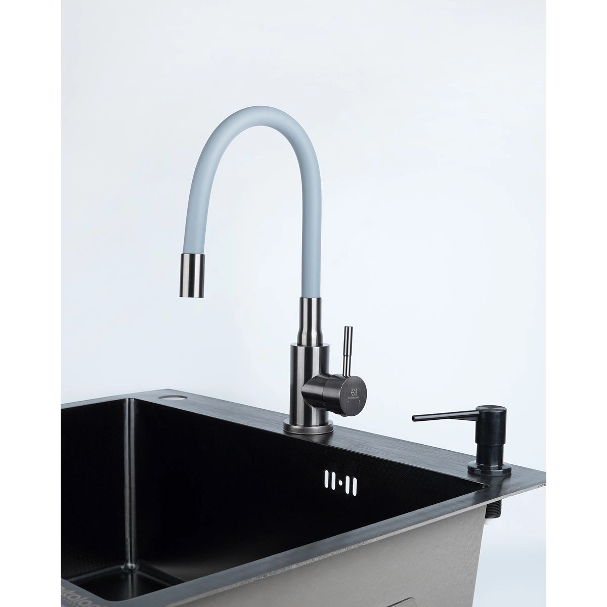 Смеситель для кухни гибкий гусак из нержавеющей стали, цвет графит с - это высокое качество по доступной цене. Смеситель изготовлен из нержавеющей стали, стойкой к коррозии, резким изменениям давления и перепадам температуры воды. Гибкий серый поворотный гусак позволяет беспроблемно мыть даже самую габаритную посуду. Аэратор насыщает воду воздухом, делая расход минимальным, а саму воду более мягкой. Плавный ход ручки, точность регулировки температуры и напора воды достигается установленным качественным керамическом картриджем. Актуальный дизайн смесителя сделает вашу кухню современной и будет радовать долго время. При выборе смесителя кухонного обратите внимание на его функциональность, качество материалов и сборки, а также на соответствие стилю вашей кухни. Сочетание графитового и серого цветов может быть отличным выбором, если вы хотите добавить изысканности и современности в интерьер. Габаритные размеры: высота смесителя 330 мм, ширина 40 мм, вылет смесителя 150 мм, высота основания 80 мм, ширина основания 42 мм, ручка 90 мм, толщина излива 17 мм, длина гусака в развернутом виде 470 мм, диаметр аэратора 23 мм, длина подводки 500 мм, диаметр крепления 32 мм, высота крепления 55 мм.