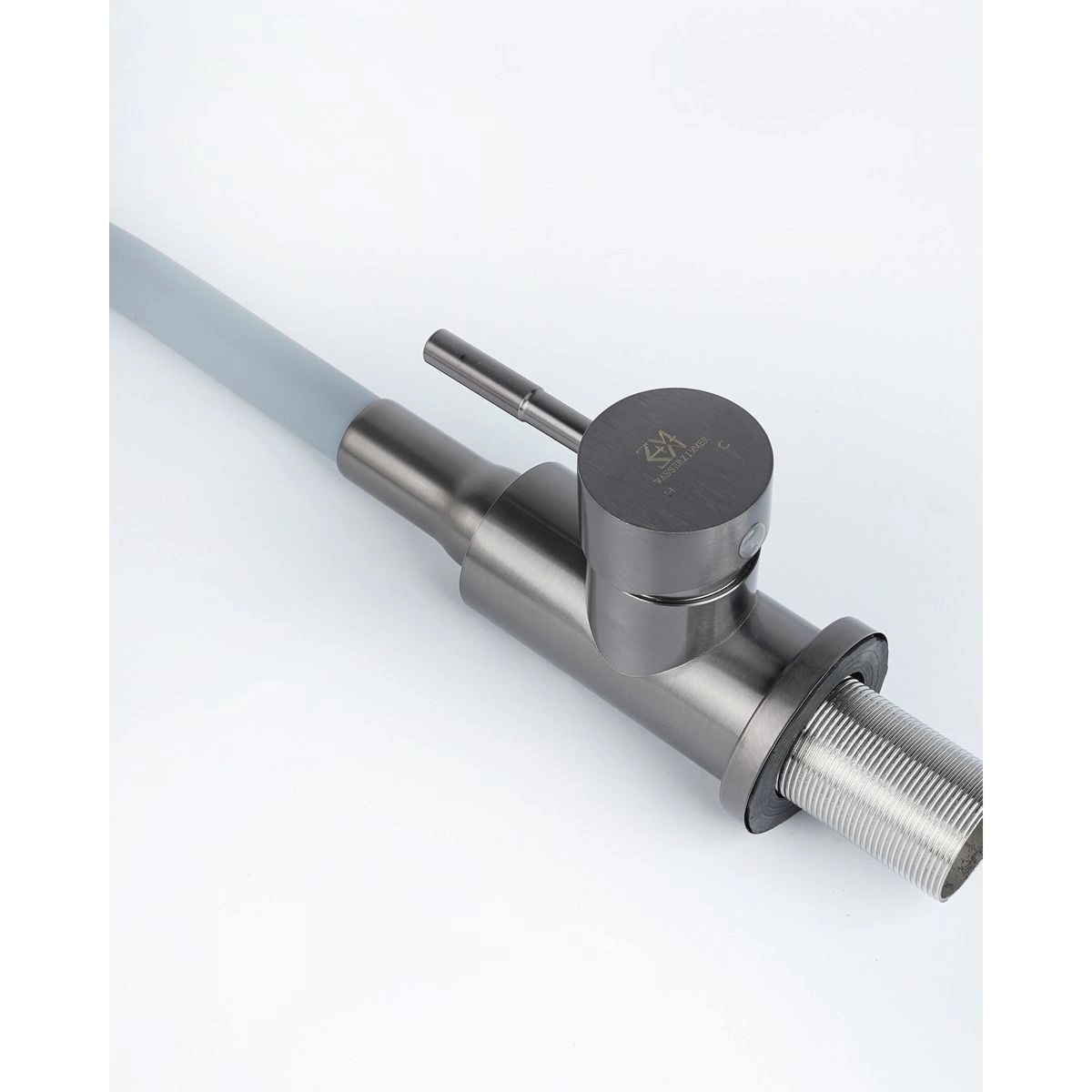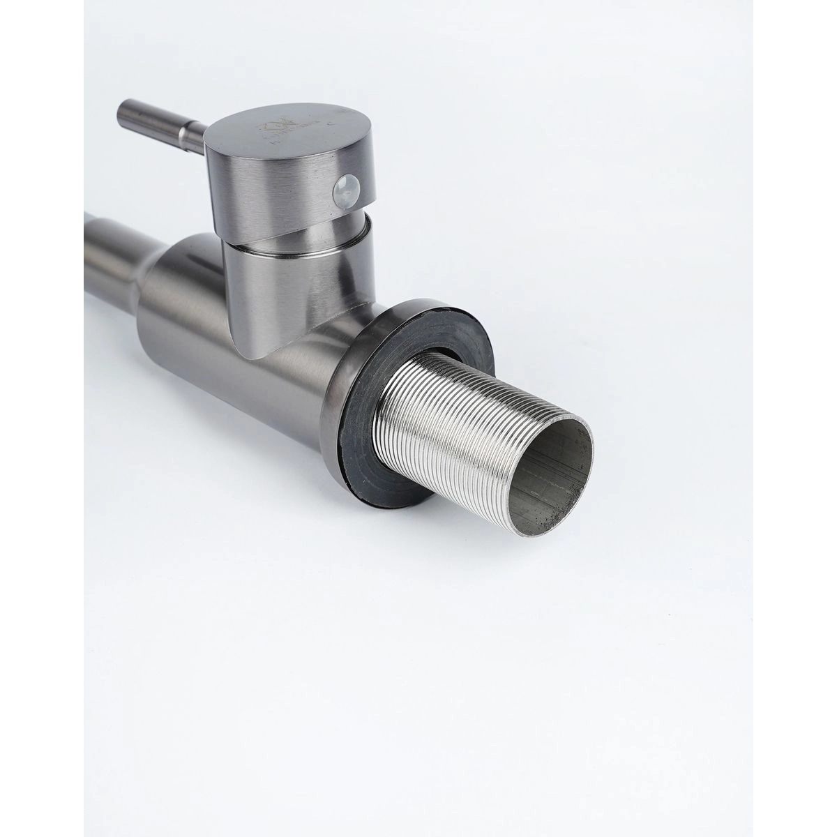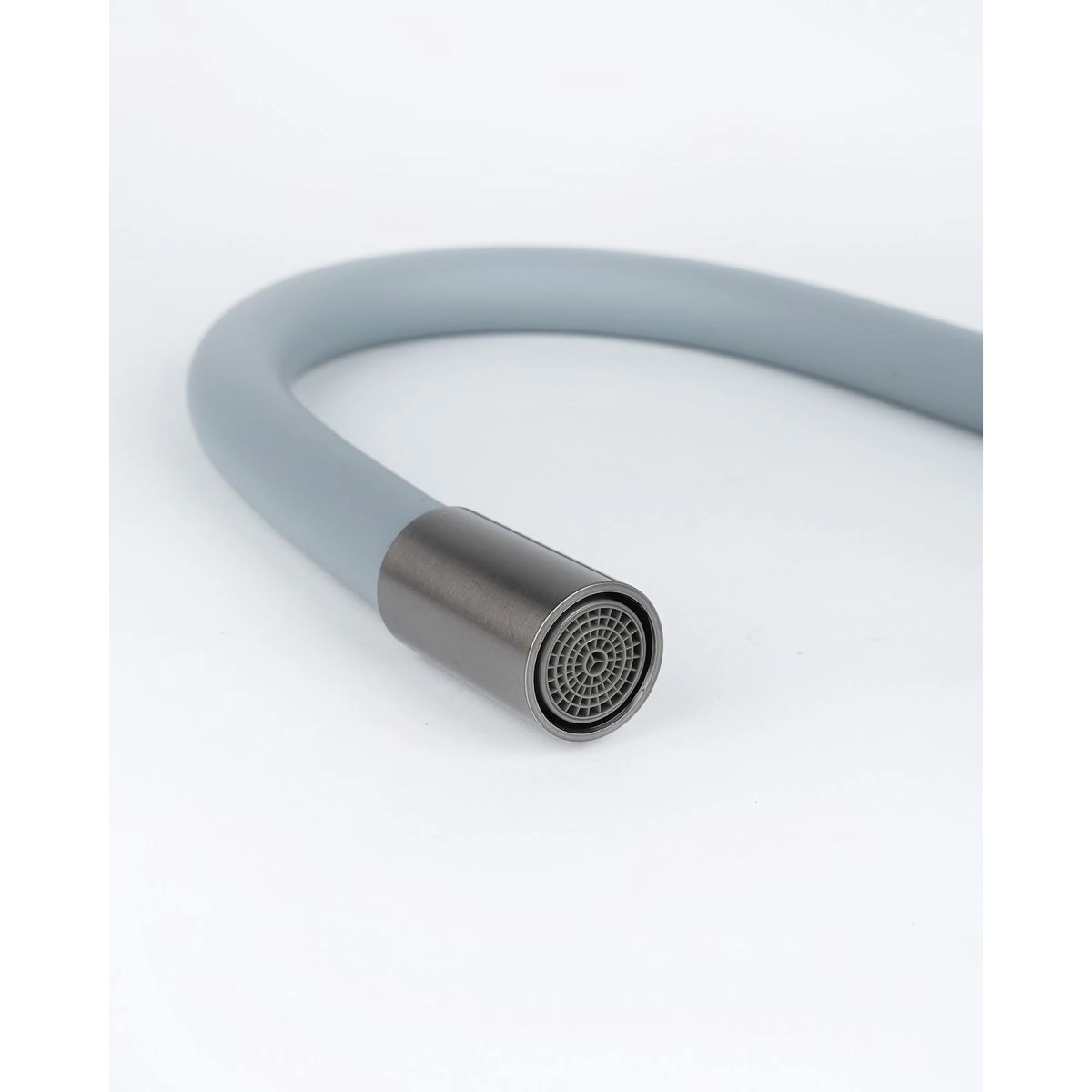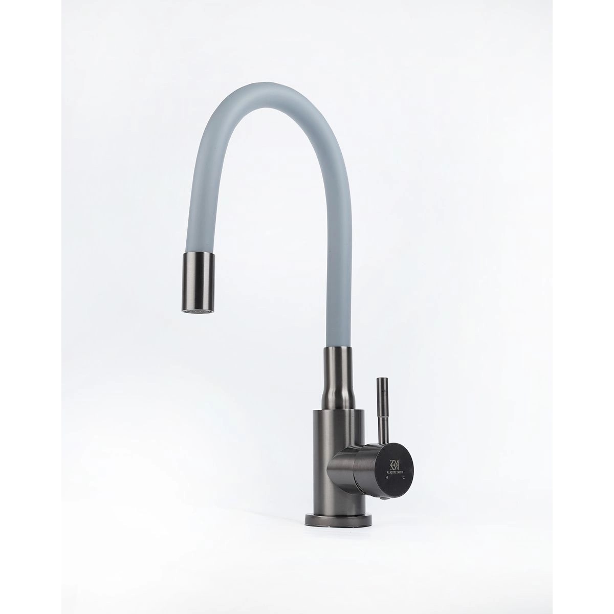 Смеситель для кухни гибкий гусак из нержавеющей стали, цвет графит с - это высокое качество по доступной цене. Смеситель изготовлен из нержавеющей стали, стойкой к коррозии, резким изменениям давления и перепадам температуры воды. Гибкий серый поворотный гусак позволяет беспроблемно мыть даже самую габаритную посуду. Аэратор насыщает воду воздухом, делая расход минимальным, а саму воду более мягкой. Плавный ход ручки, точность регулировки температуры и напора воды достигается установленным качественным керамическом картриджем. Актуальный дизайн смесителя сделает вашу кухню современной и будет радовать долго время. При выборе смесителя кухонного обратите внимание на его функциональность, качество материалов и сборки, а также на соответствие стилю вашей кухни. Сочетание графитового и серого цветов может быть отличным выбором, если вы хотите добавить изысканности и современности в интерьер. Габаритные размеры: высота смесителя 330 мм, ширина 40 мм, вылет смесителя 150 мм, высота основания 80 мм, ширина основания 42 мм, ручка 90 мм, толщина излива 17 мм, длина гусака в развернутом виде 470 мм, диаметр аэратора 23 мм, длина подводки 500 мм, диаметр крепления 32 мм, высота крепления 55 мм.