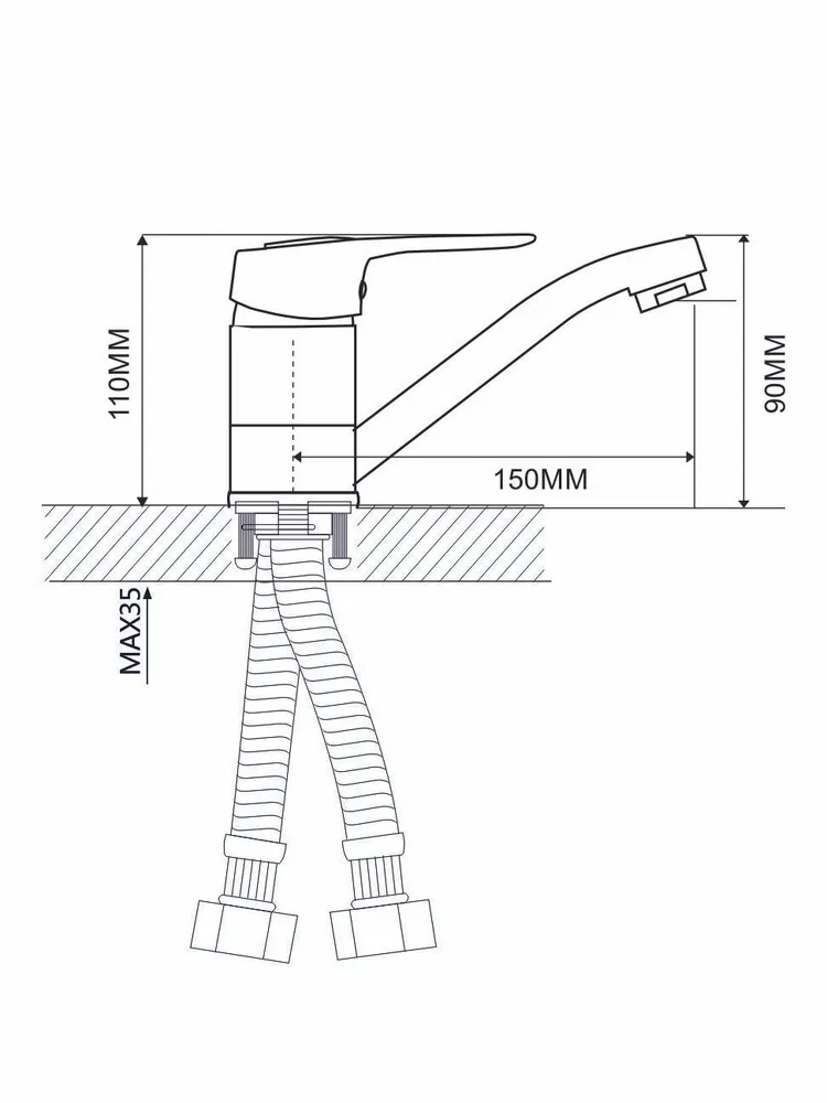 Подключение к водопроводу осуществляется через гибкую подводку с стандартным разъёмом 1/2″. Смеситель монтируется на раковину или столешницу через одно отверстие. .