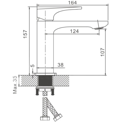 Для монтажа требуется одно отверстие диаметром 35 мм; крепление выполняется на гайку. В комплекте идёт гибкая подводка со стандартным присоединительным размером 1/2 дюйма, что упрощает установку. Смеситель оснащён аэратором, который равномерно распределяет поток воды, снижает шум и помогает экономить расход.