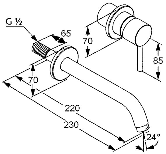 Управление осуществляется единым литым рычагом с мягким, плавным ходом — это позволяет легко и точно регулировать температуру и напор воды одним движением руки. Фиксированный излив имеет длину 230 мм, что обеспечивает удобный доступ к воде при умывании.