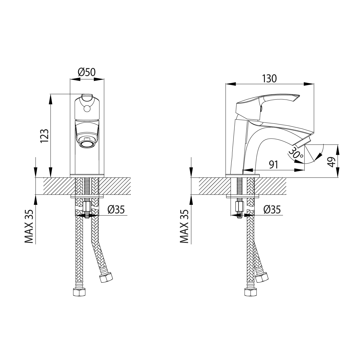 Монтаж выполняется на раковину или столешницу через одно отверстие диаметром 35 мм.